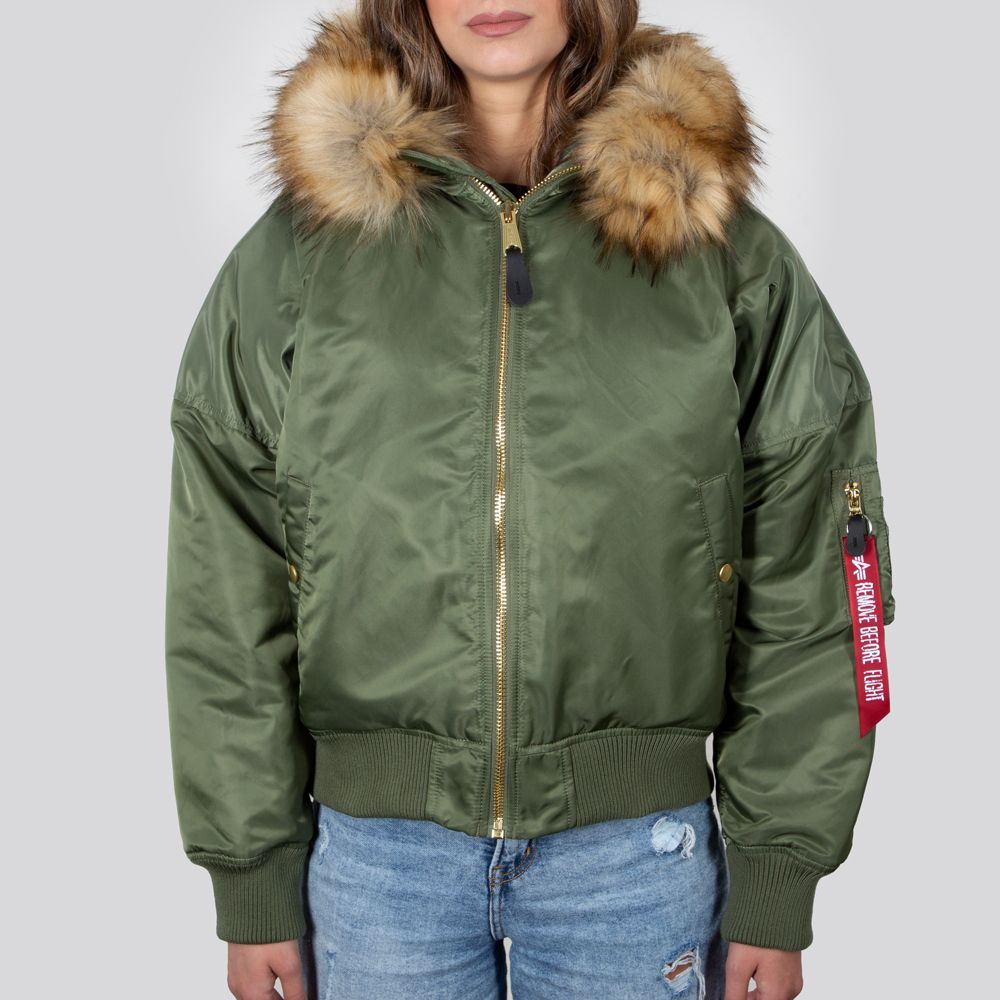 Dámska bunda bomberového strihu s kapucňou. Dve bočné vrecká a na ľavom rukáve malé vrecko na zapínanie so šnúrkou RBF, veľká kapucňa s kožušinou. Bunda je oversize strihu. Zloženie: Vonkajší materiál: 100% Nylon Podšívka: 100% Polyester