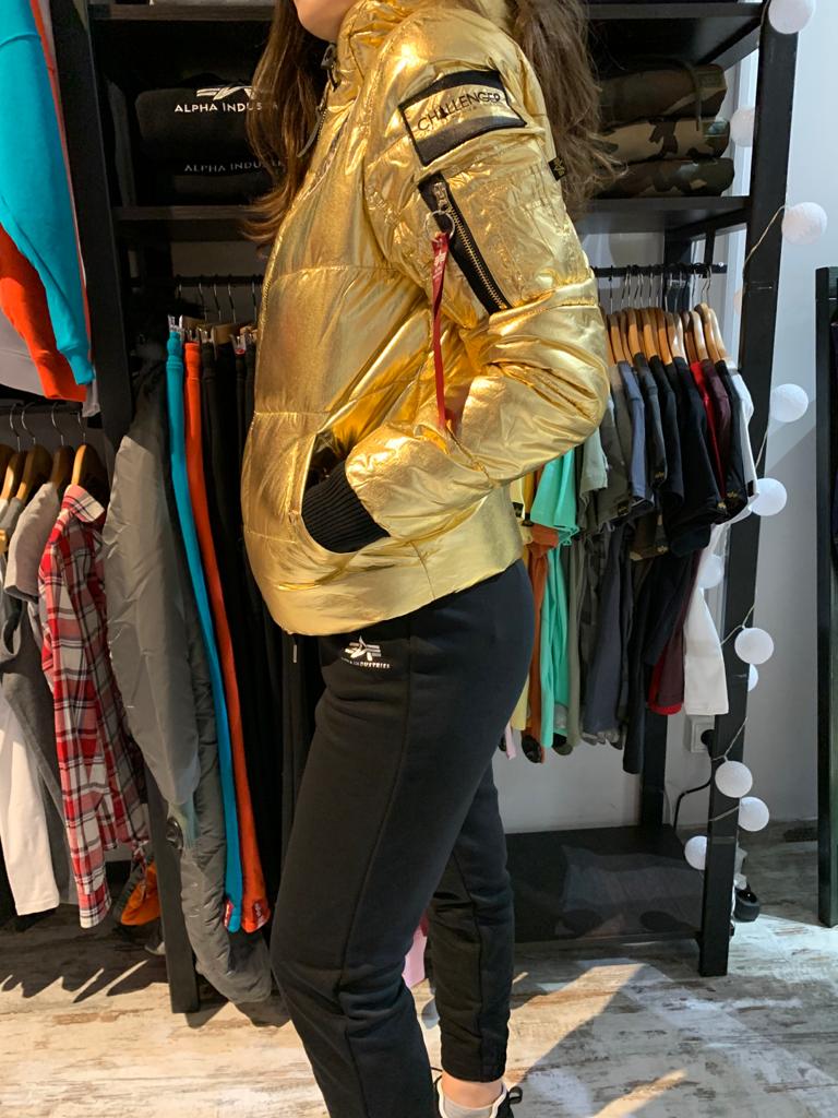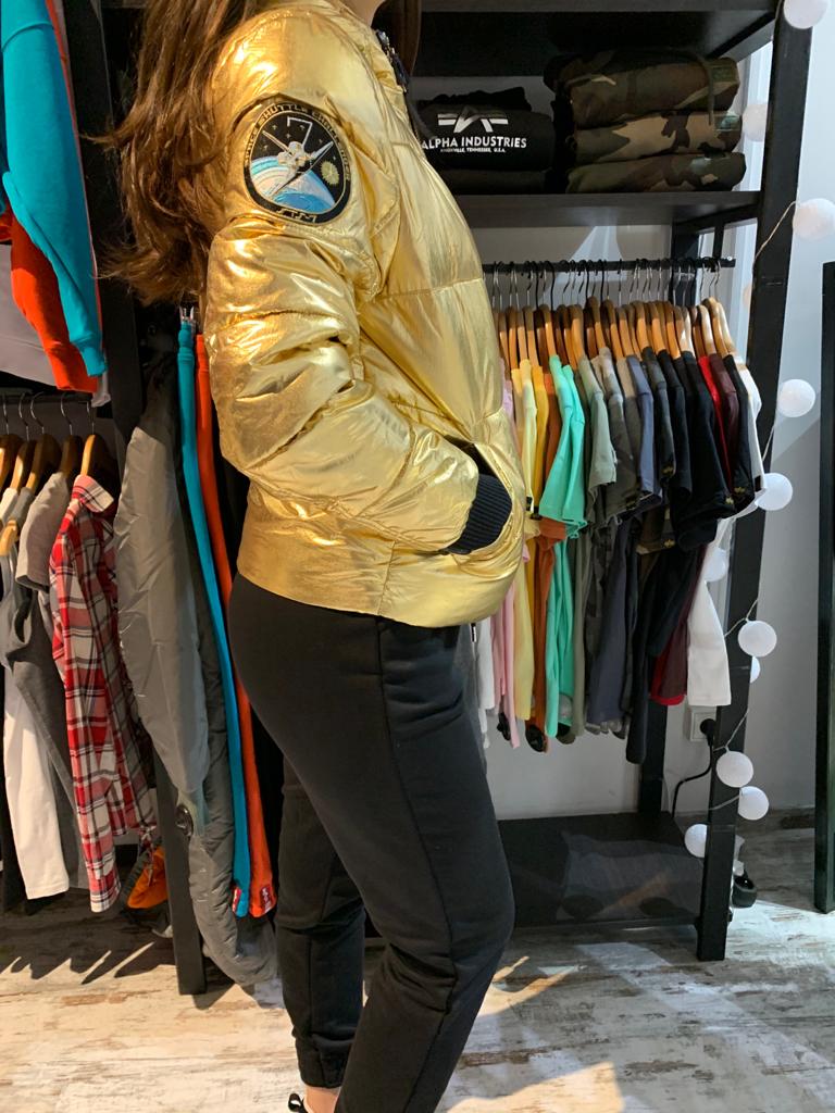 Dámska bunda z trblietavej vonkajšej látky. Zimná bunda je nastaviteľným elastickým pásom v spodnej časti bundy, s niekoľkými nášivkami  NASA a vreckom UTILITY. Zloženie: Vonkajší materiál: 100% Nylon Podšívka: 100% Polyester