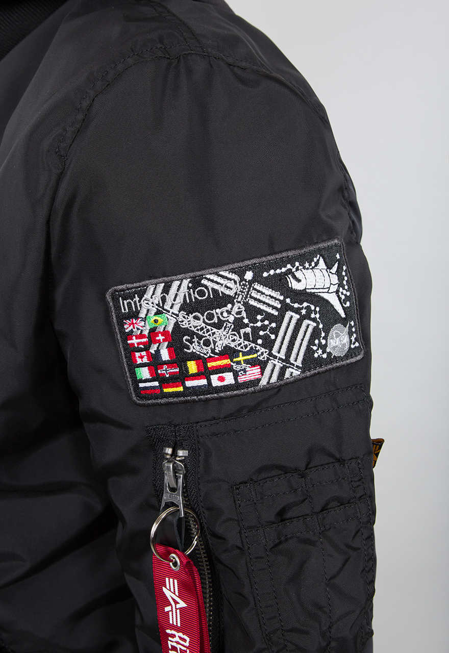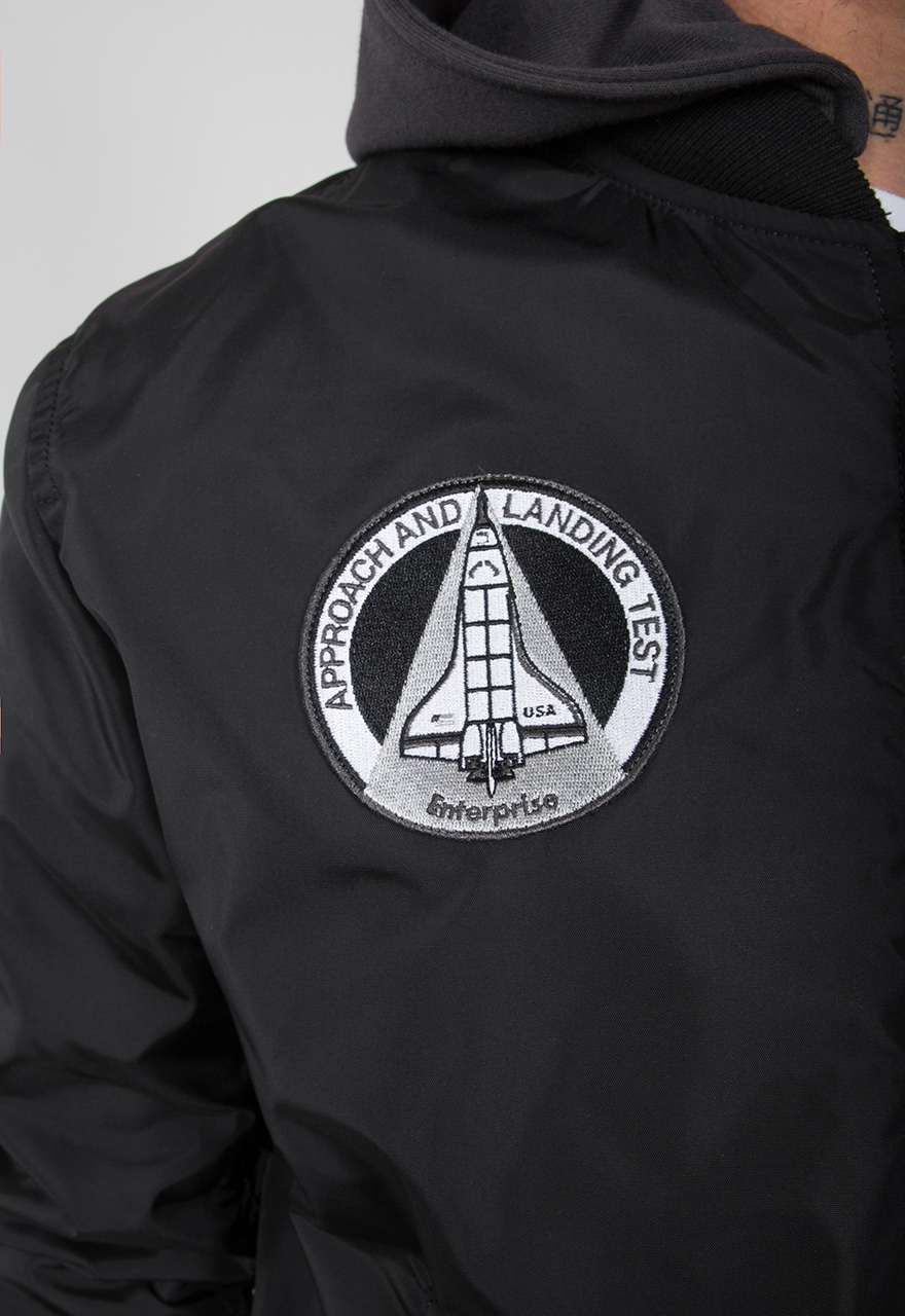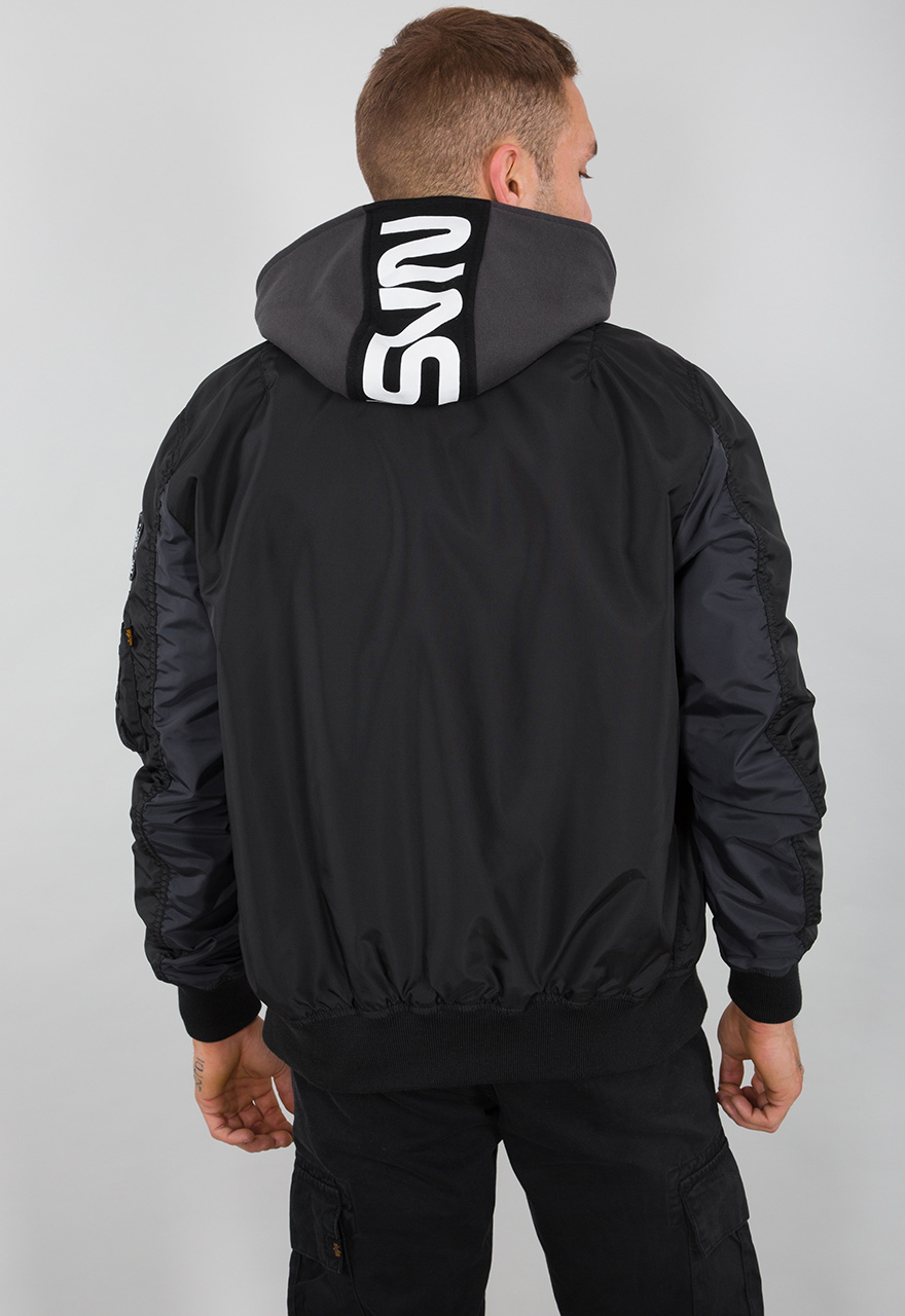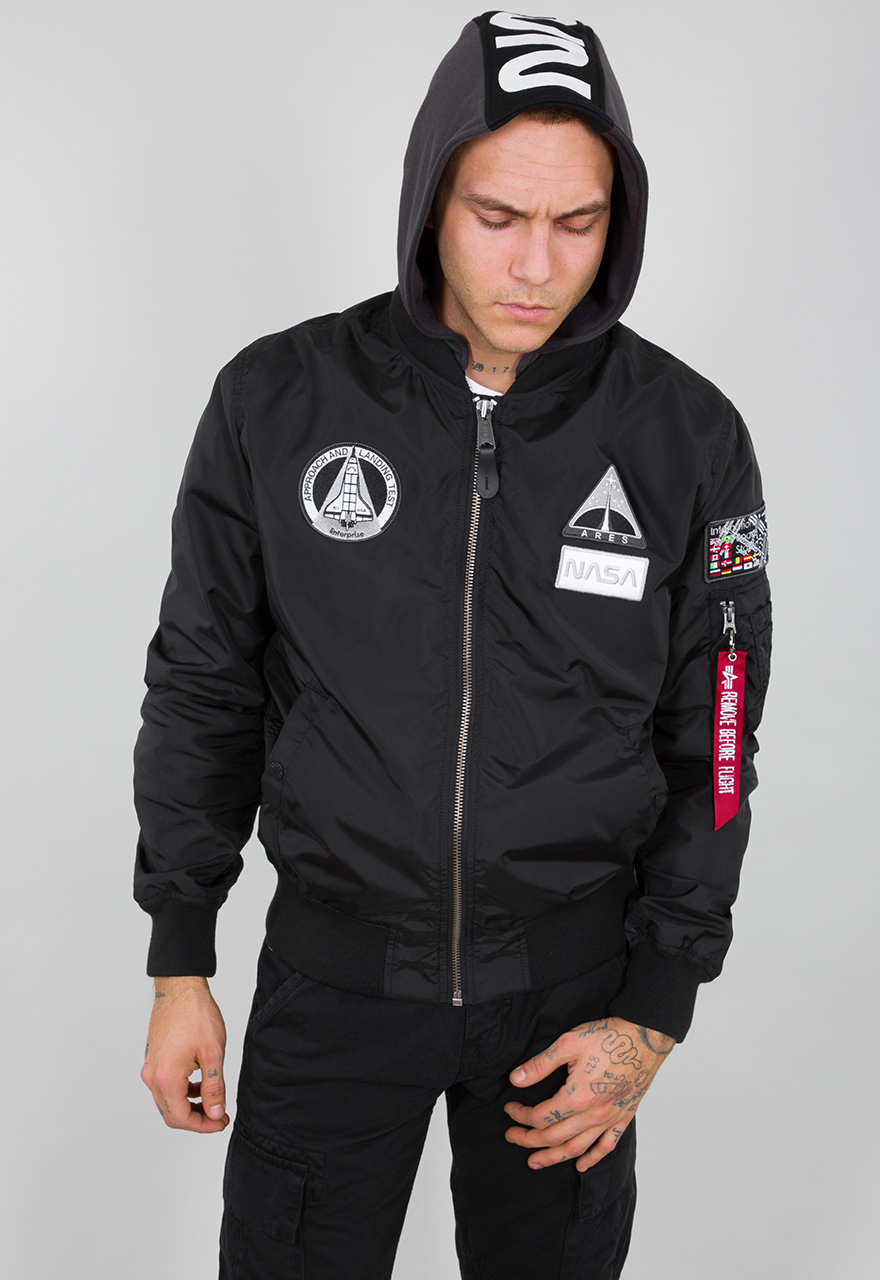 Pánska tenká bunda na zips s odnímateľnou kapucňou. Bunda úzkeho strihu v štýle Nasa s výšivanými nášivkami , s potlačenou teplákovou kapucňou.