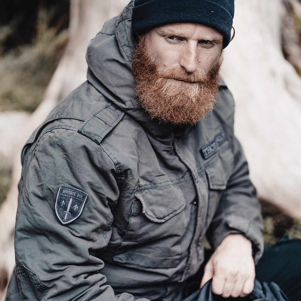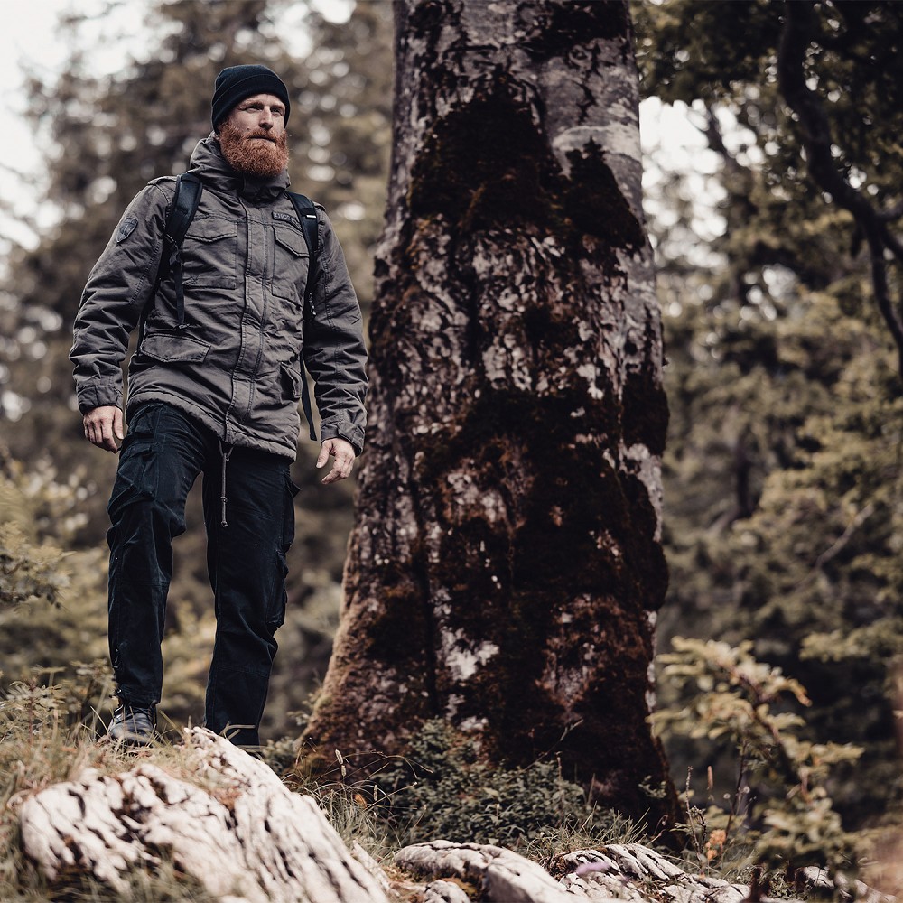 Podšitá pánska bunda s kapucňou do každého počasia. Vysoko uzatvárateľná kapucňa, vnútorná šnúrka, dve bedrové vrecká a dve náprsné vrecká sa dajú uzavrieť patentkami. Vnútorné vrecko na zips a mobilný telefón , odnímateľná nášivka na suchý zips s výšivkou nad náprsným vreckom a na ramene. Zloženie: Vrchný materiál: 100% Bavlna Podšívka: 100% Polyesterová plyšová kožušina
