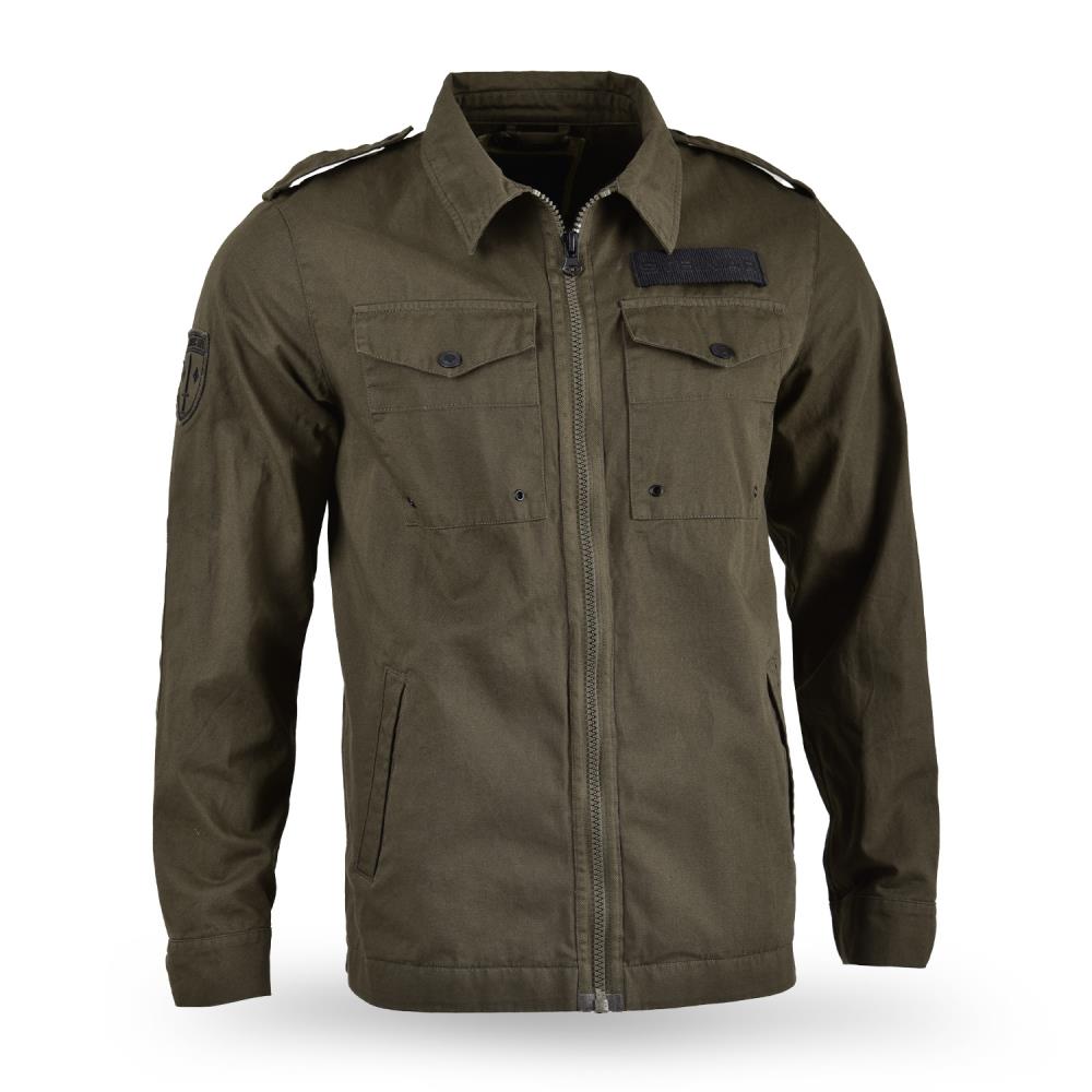 Pánska bavlnená bunda na zips. Na boku dve vrecká, dve náprsné vrecká, nášivka nad ľavým náprsným vreckom. Na pravom ramene nášivka. Zloženie: 100% Bavlna Starostlivosť o odev: Čistiareň
