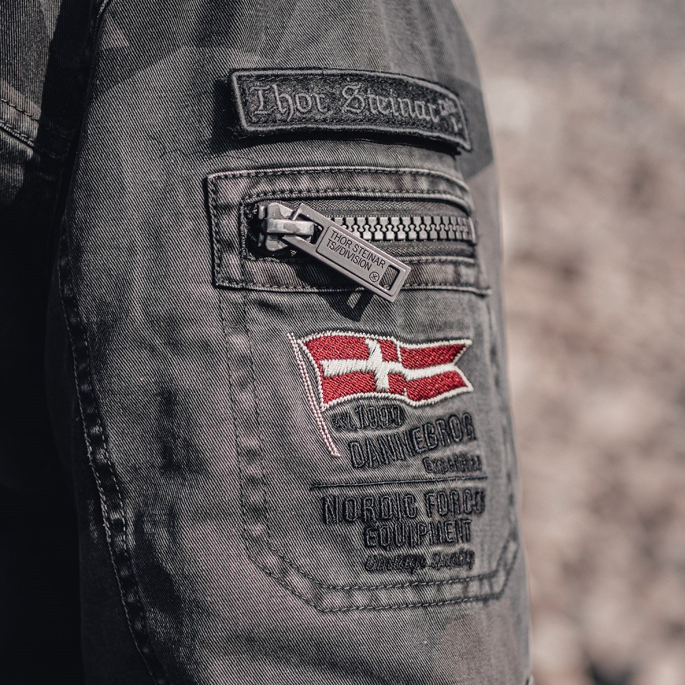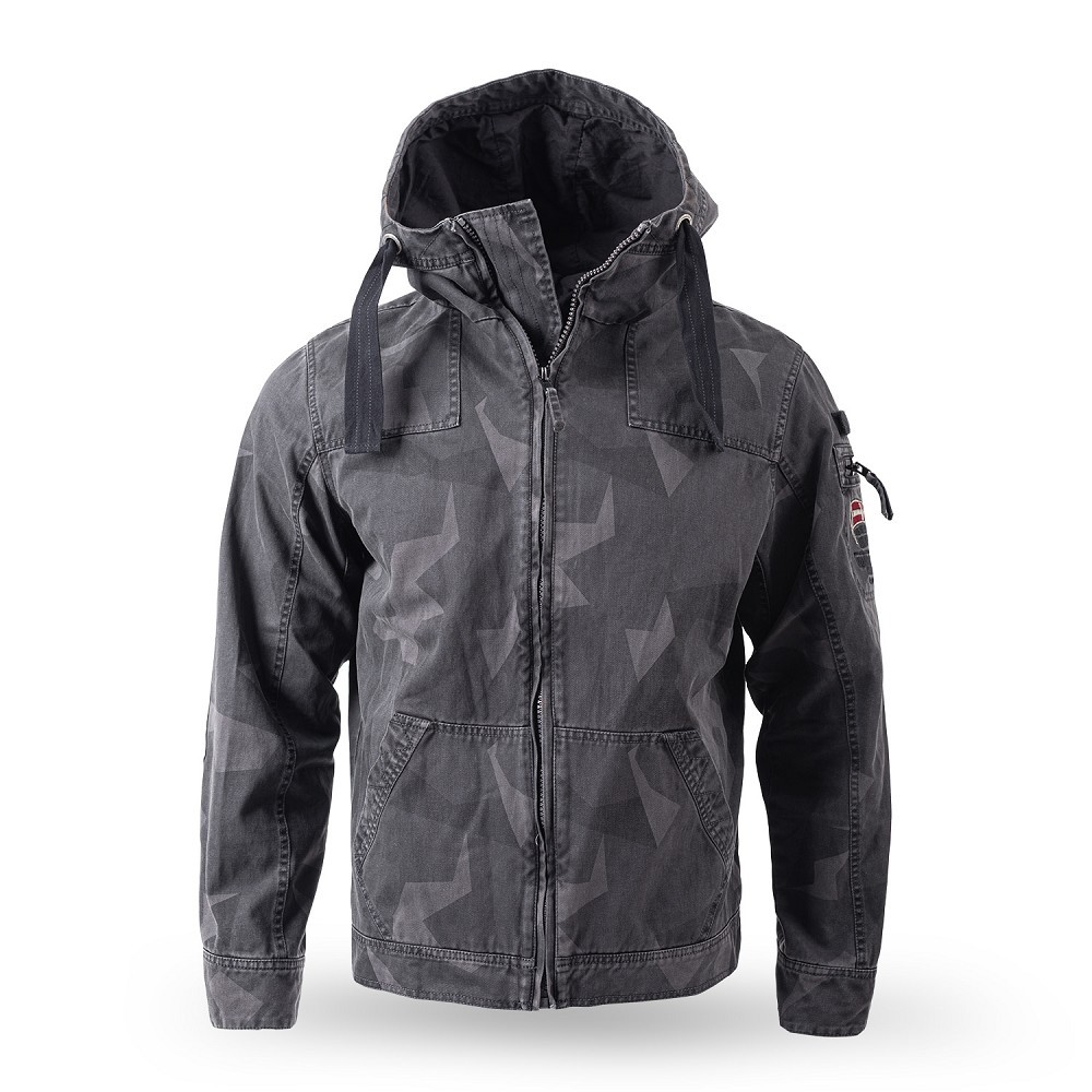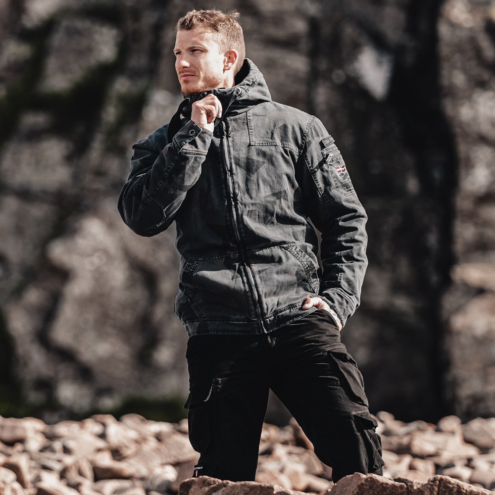 Pánska bunda na zips s kapucňou. Bočné vrecká, vrecko na zips v hornej časti ramena. Vnútorné vrecko na zips a mobilný telefón, výšivka a vyšívaná nášivka na suchý zips na ramene. Zloženie: 100% Bavlna