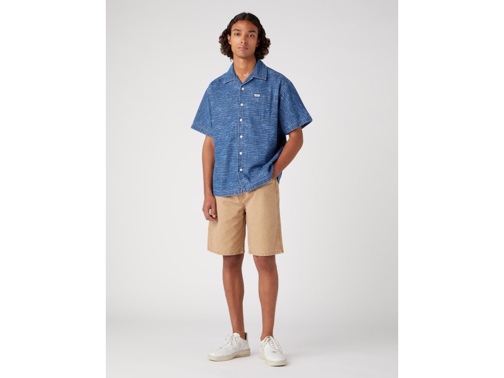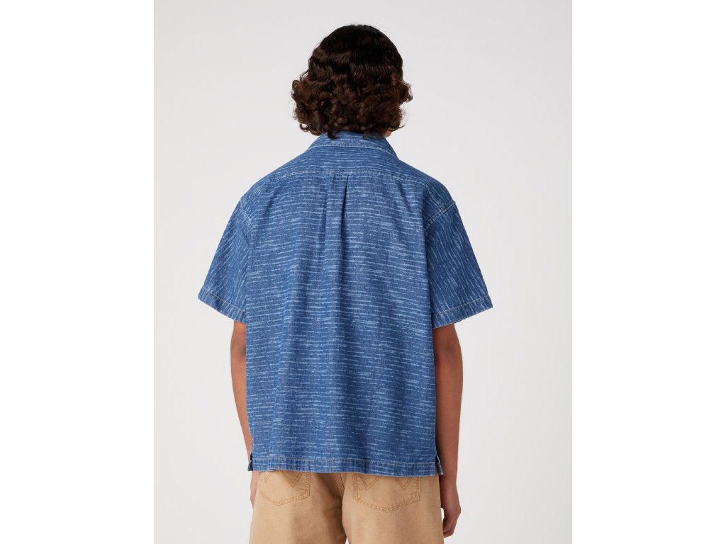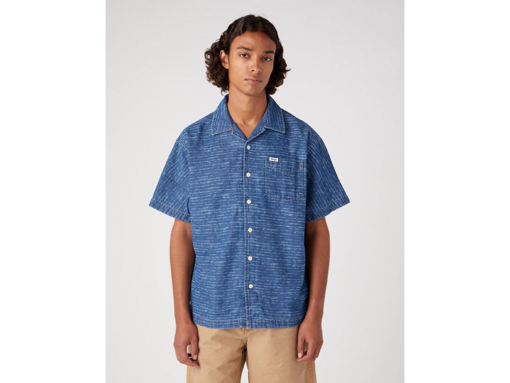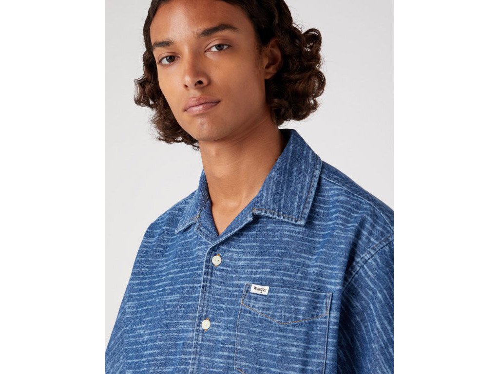 Žíhaná modrá džínsová košeľa s jedným vreckom vo voľnom strihu s jemným svetlým vodorovným vzorom. Košeľa je voľnejšieho strihu s krátkym rukávom. Zapínanie na gombíky.