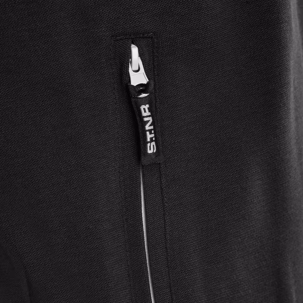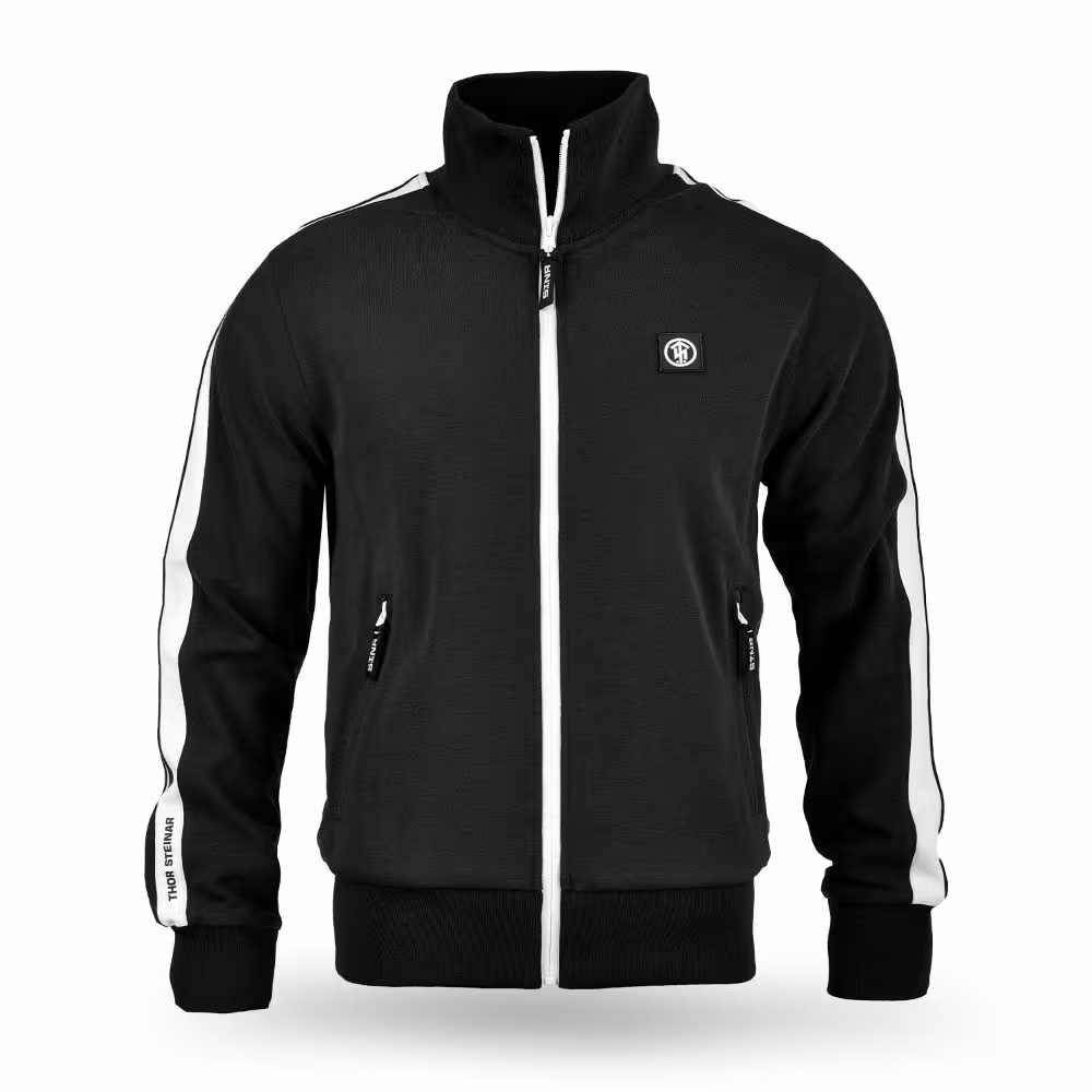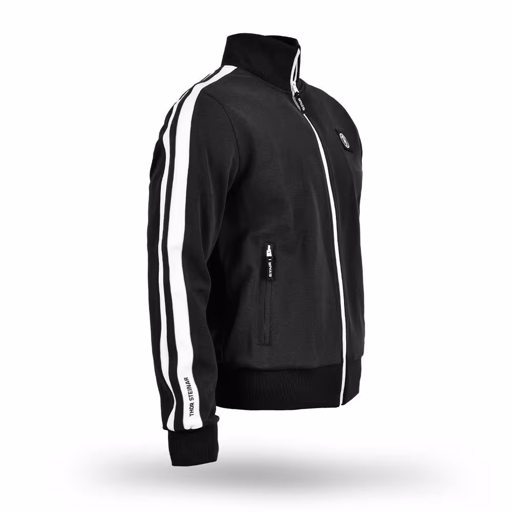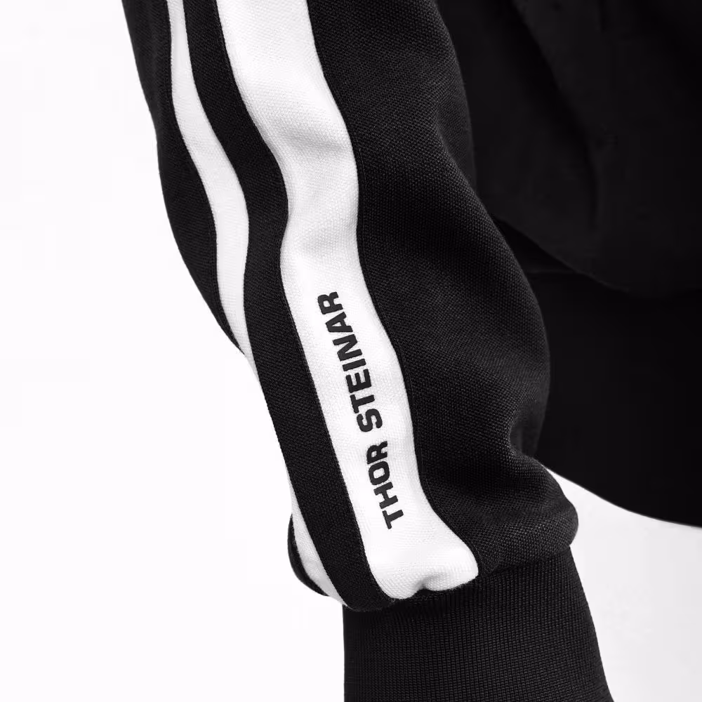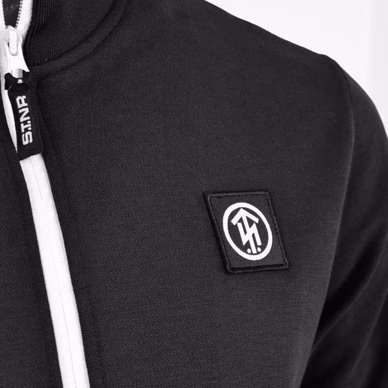 Športová, priliehavá mikina s úzkym golierom. Tkaná nášivka s logom a vyšívanými okrajmi na hrudi, kontrastné pruhy na rukáve, decentná potlač na ľavom rukáve, výrazný dizajn chrbta s vyvýšenou potlačou, uzatvárateľné bočné vrecká a tkané ťahače loga na zipsoch.