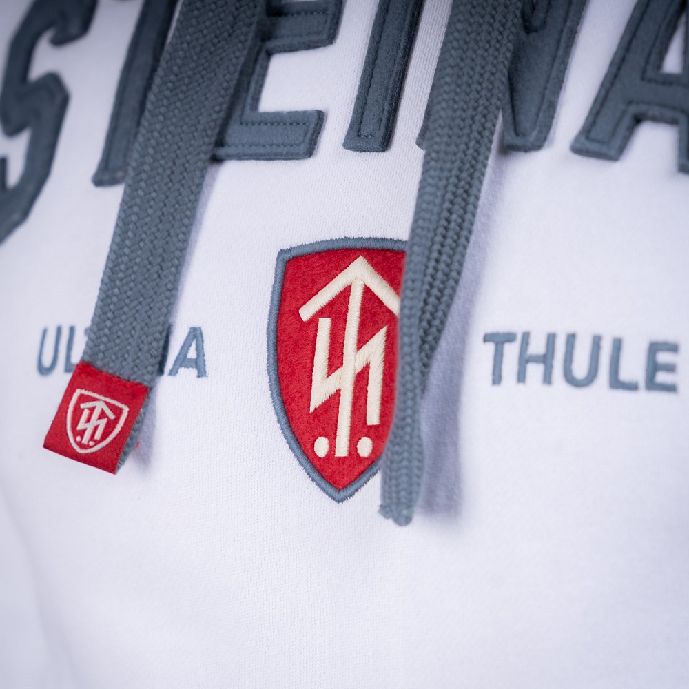 Mikina s kapucňou s typickým dizajnom Thor Steinar. Dvojitá prešitá kapucňa so štítkom na leme, veľké predné vrecko. Lem a manžety sú vyrobené s kvalitného úpletu. Veľký predný nápis v kombinácii našitých písmen a výšivky. Zloženie: 70% Bavlna 30% Polyester
