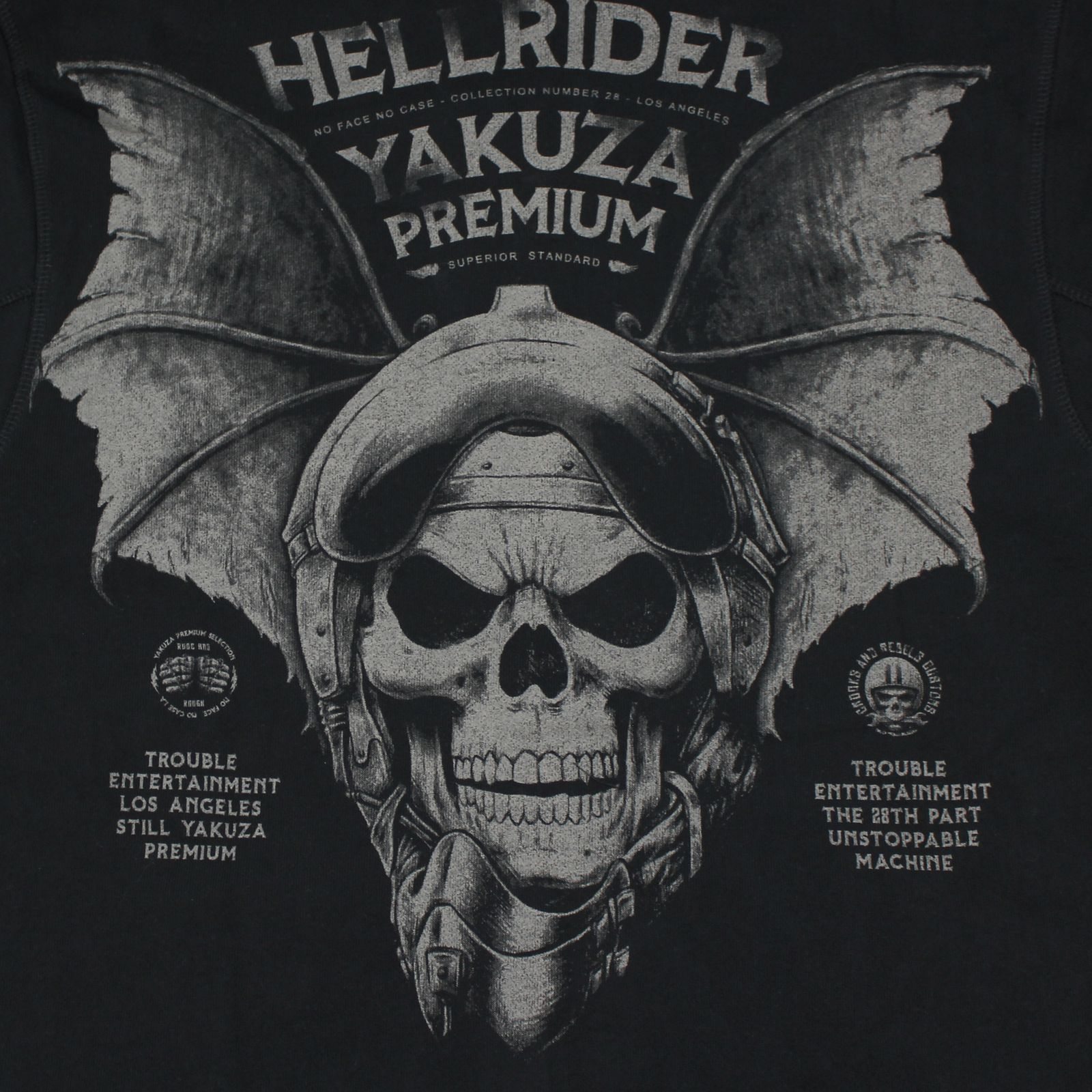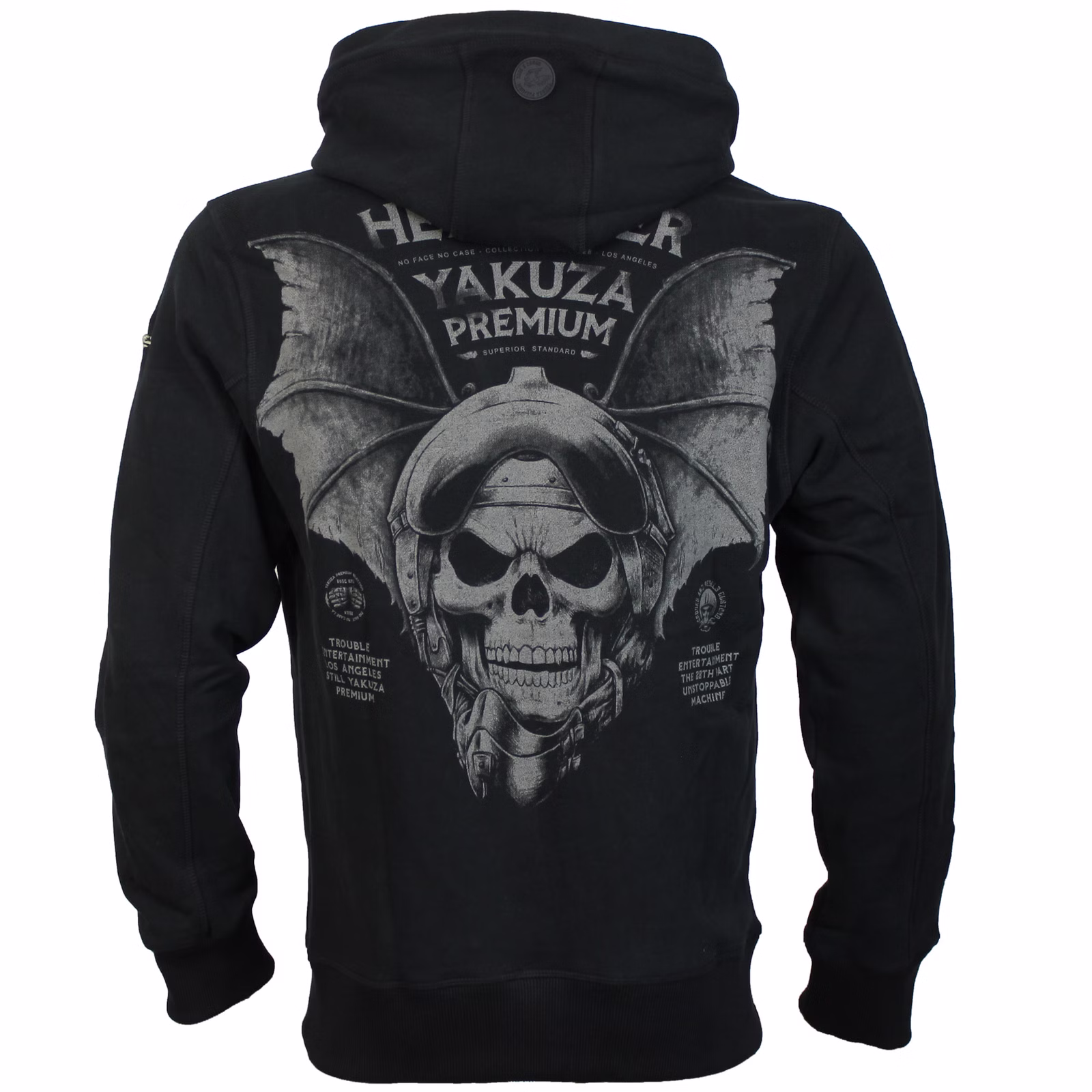 Špeciálna mikina YPHZ 4024 v čiernej farbe z kolekcie Yakuza Premium Selection. Ide o limitovanú edíciu mikinu na zips z kolekcie 40. rokov. Mikina má kapucňu, zapínanie na zips a predné vrecká. Chrbát zdobí veľká, viacfarebná potlač netopierej lebky, zatiaľ čo potlač sa nachádza aj na ľavej strane hrude. Je to skutočne skvelá mikina vyrobená z pohodlnej, mäkkej bavlnenej zmesi. Rozmery pre veľkosť XL, v plochom stave, sú: pás/hrudník/chrbát/šírka rukávov 50/58/68/60 cm.