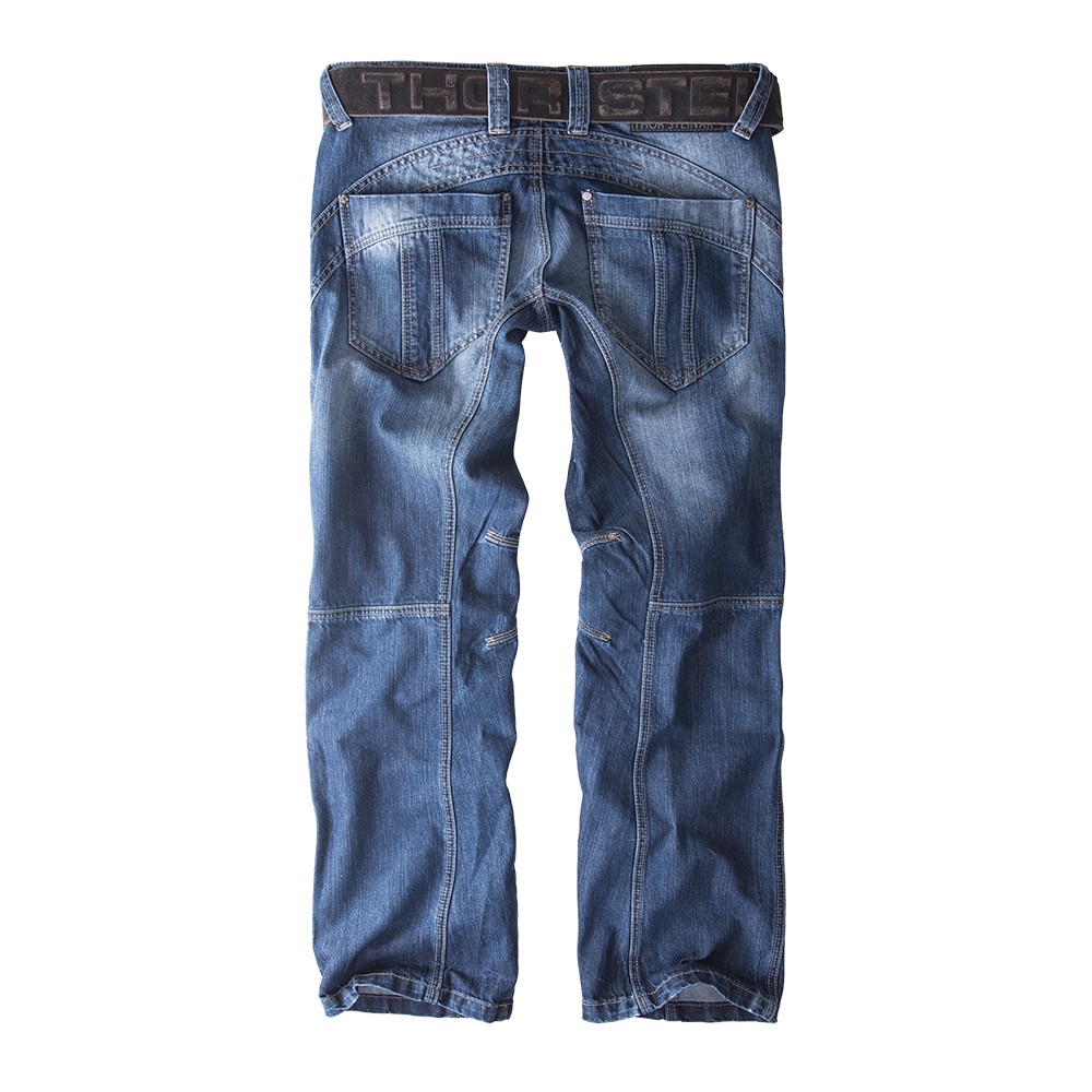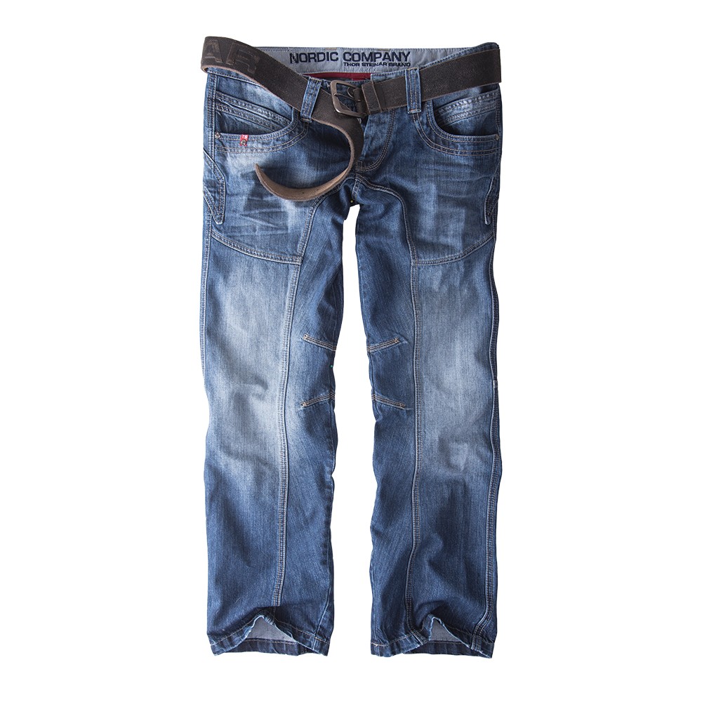 Moderné päť-vreckové rifle Thor Steinar. Zapínanie na gombíky, pekné ozdobné prešívanie a švy, anatomicky tvarované kolená. Kožený patch na zadnej strane.  Opasok nie je súčatou. Materiál 100% bavlna