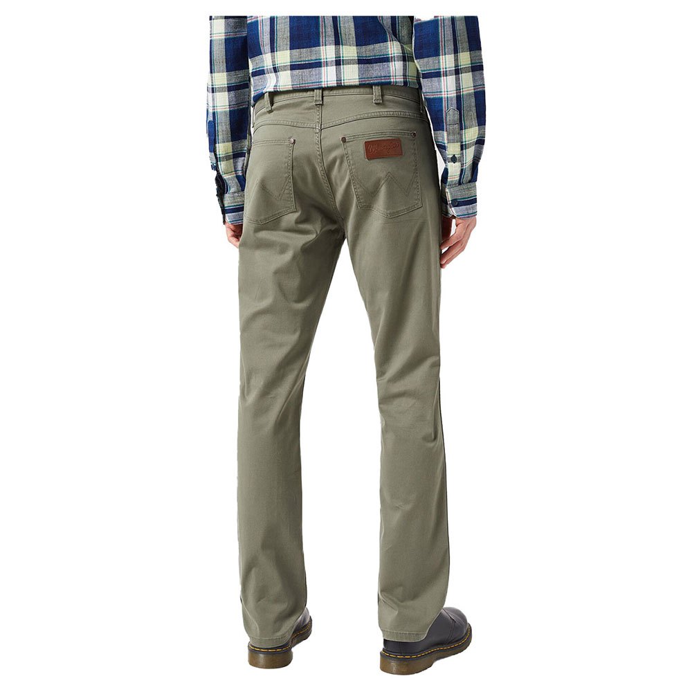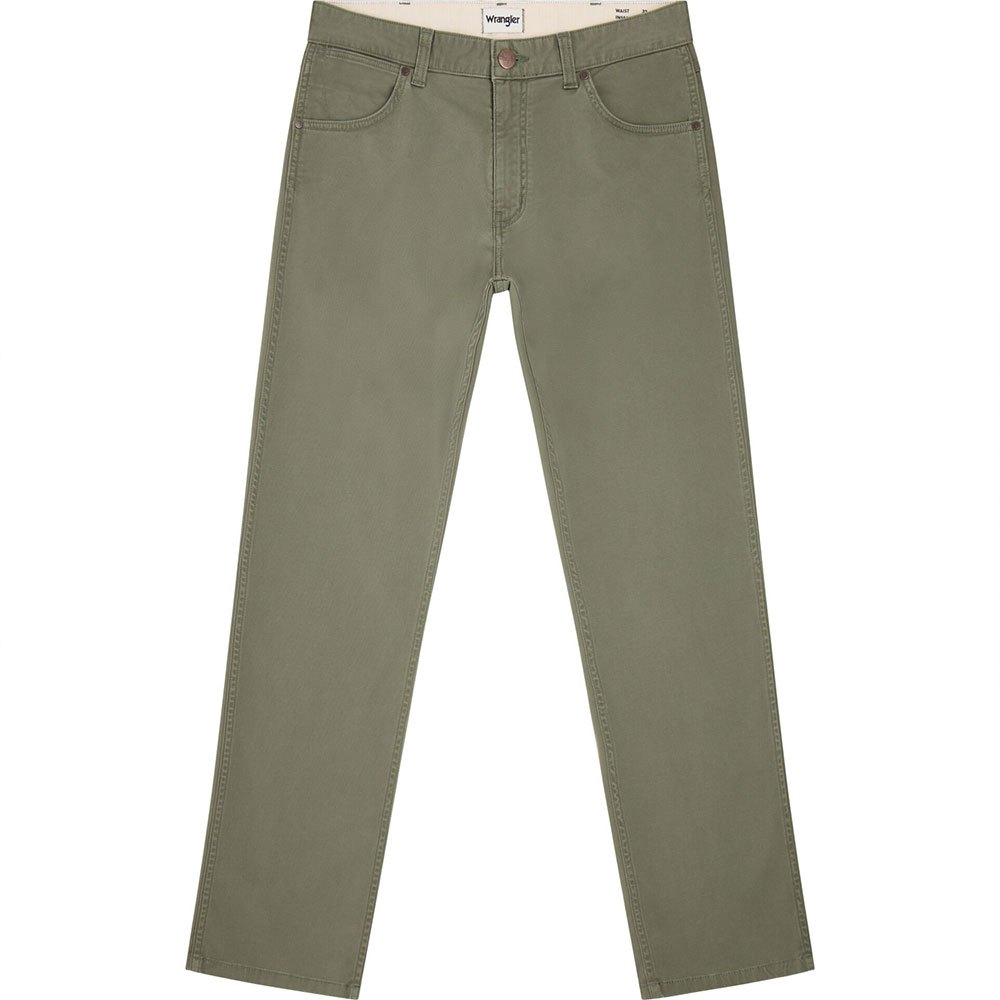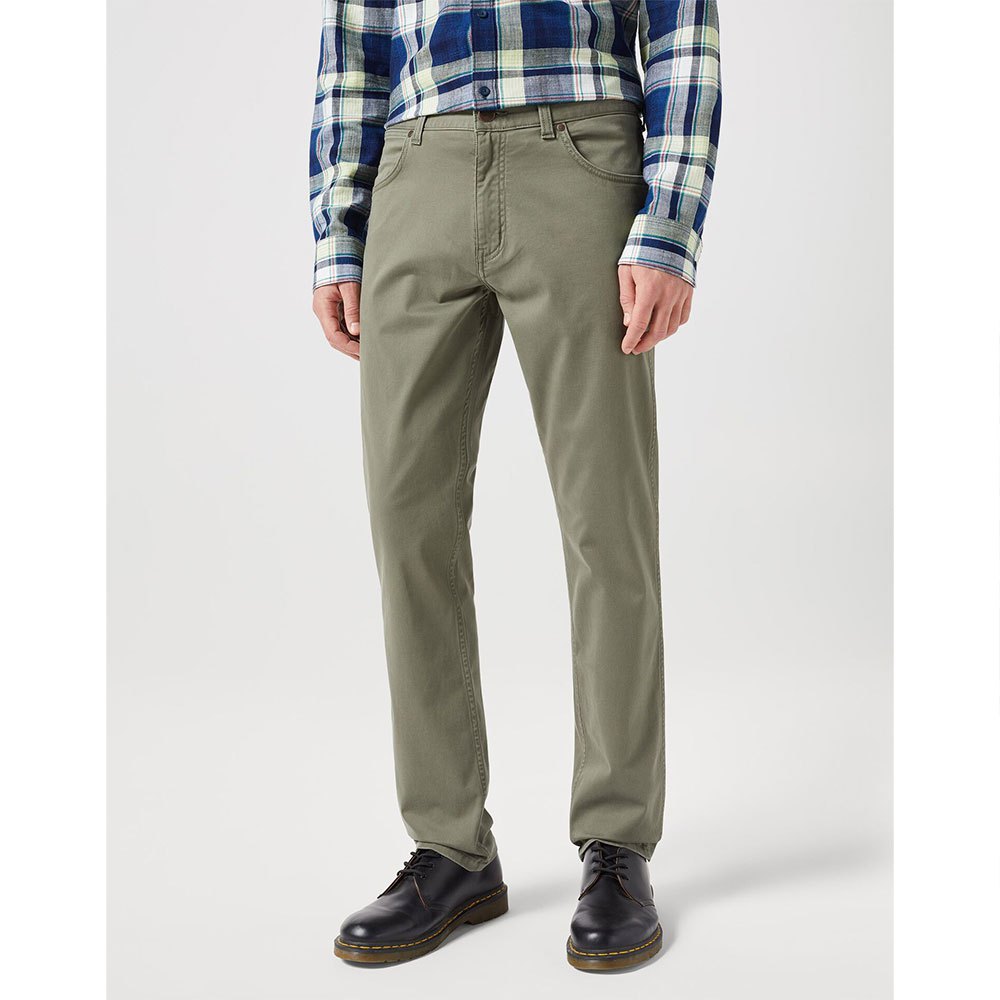 Látkové nohavice WRANGLER v obľúbenom strihu GREENSBORO vo farbe dusty olive. Zapínanie na zips a gombík. Na pravom zadnom vrecku nájdete typickú koženú nášivku s logom značky WRANGLER.