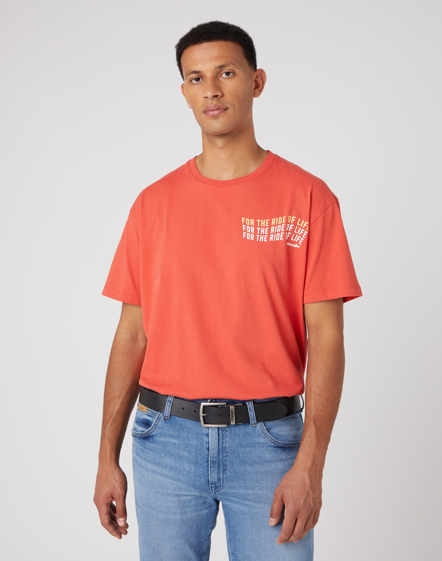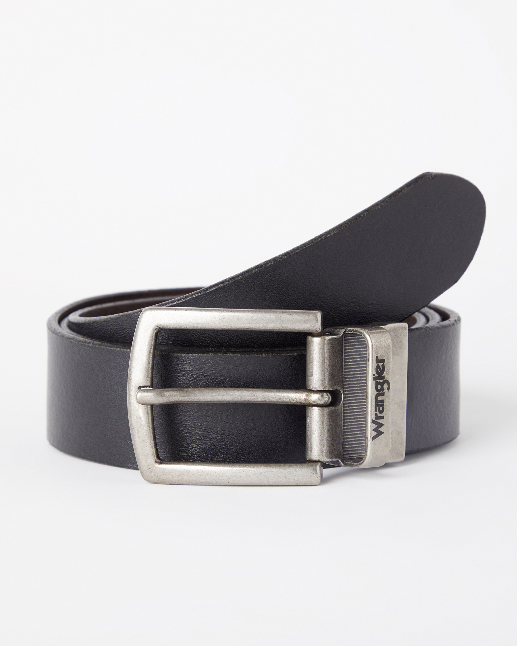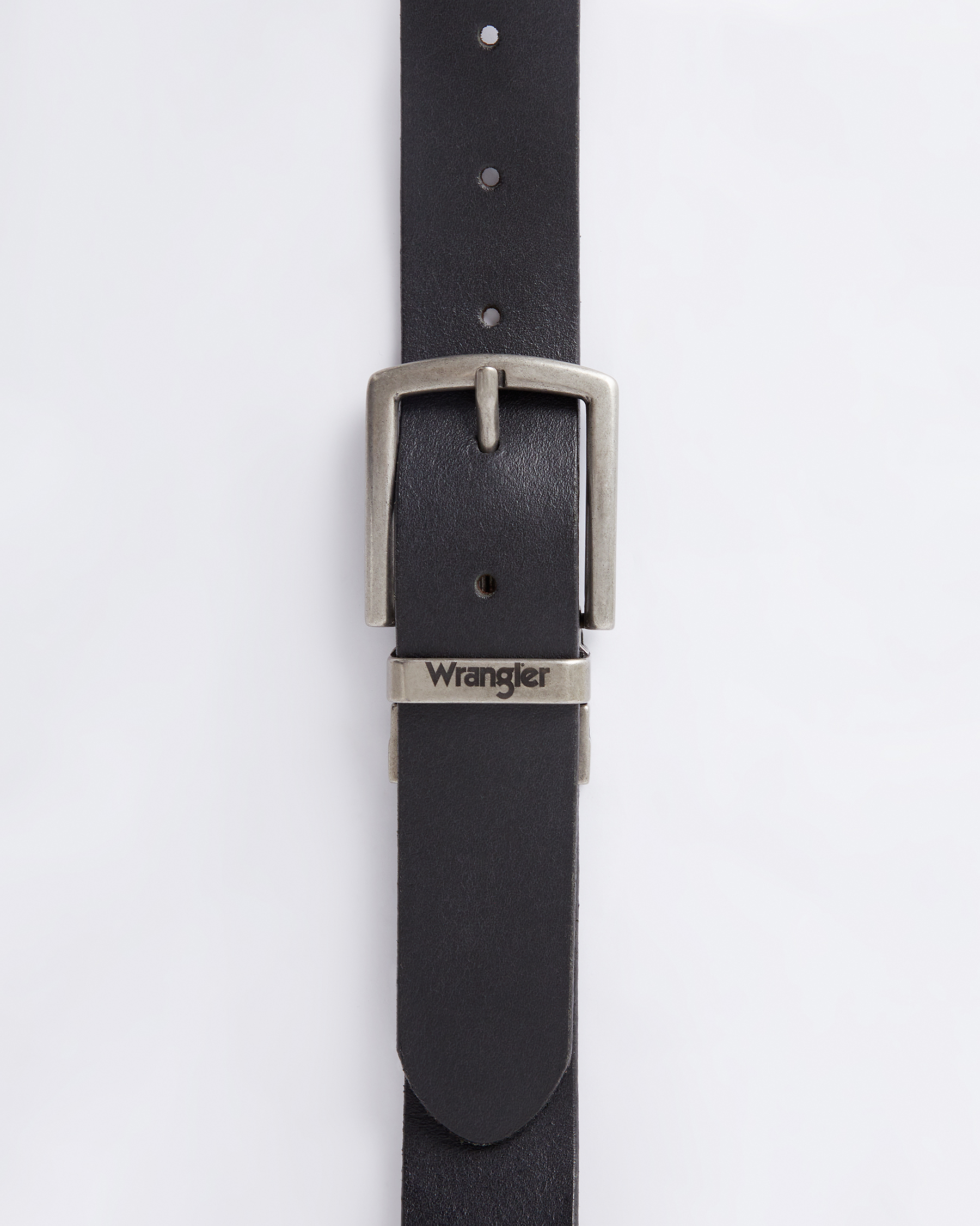 Pánsky kožený opasok čiernej farby s otvorenou kontrastnou mosadznou sponou a koženou prackou. Vyrazené logo WRANGLER zdobí mosadznú sponu. Ide o veľmi jednoduchý opasok , ktorý využije k tmavým aj k svetlým džínsom.