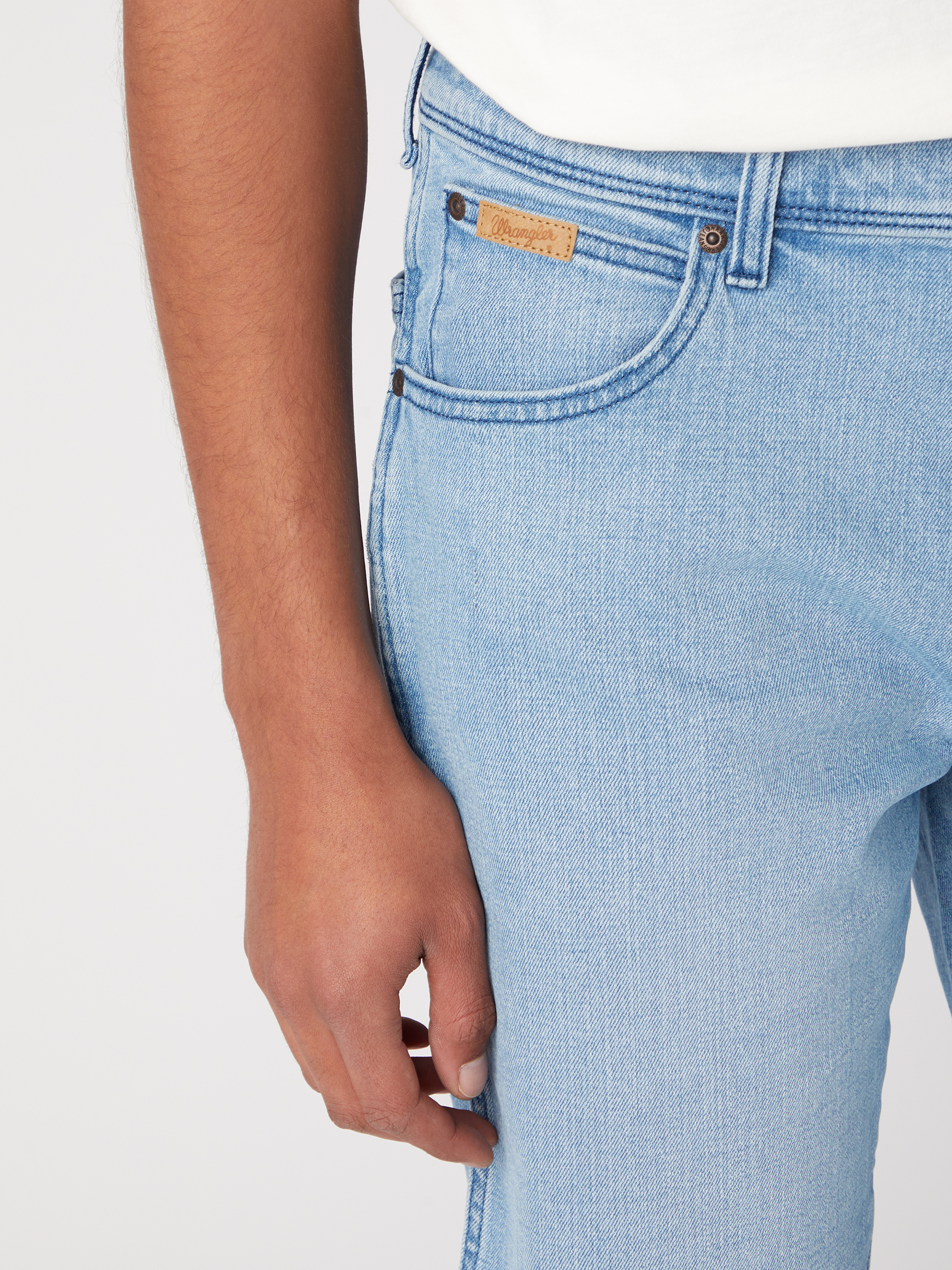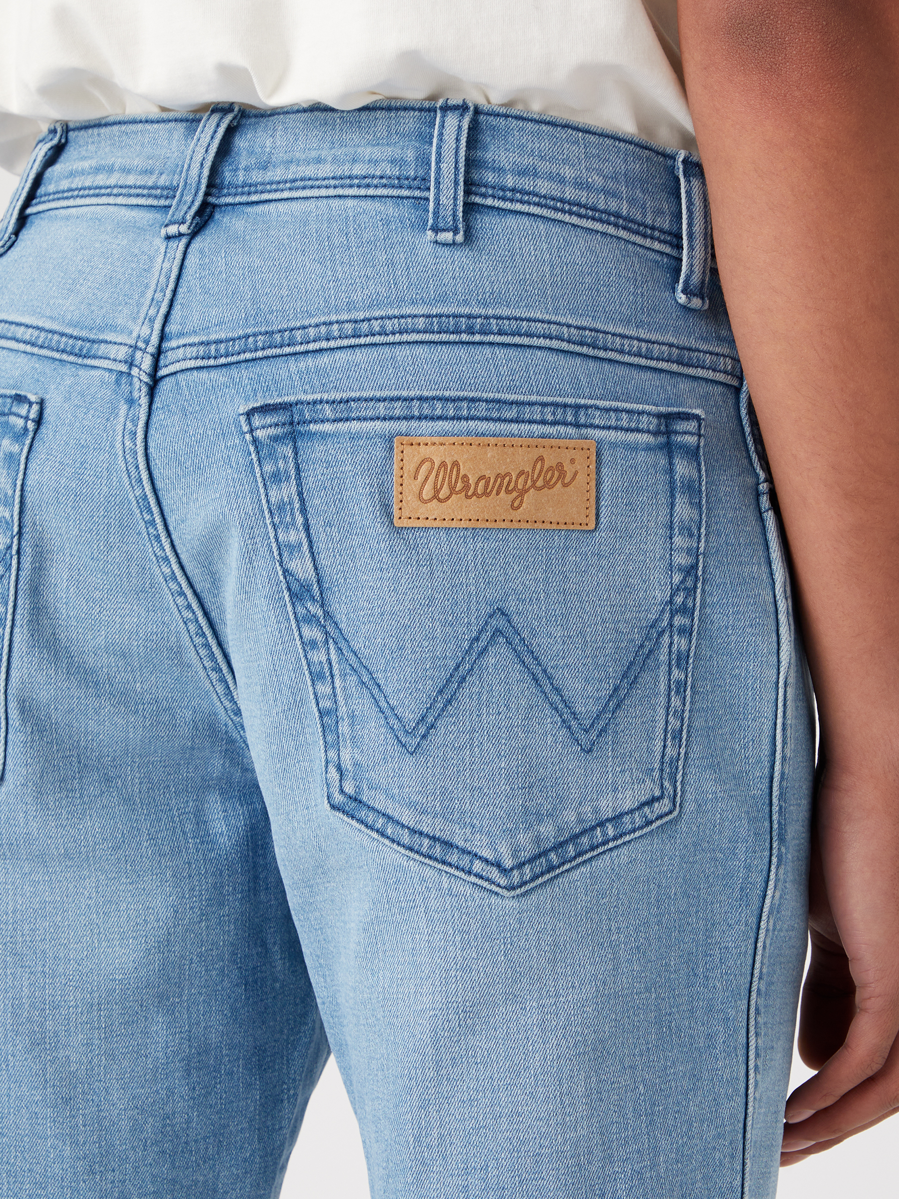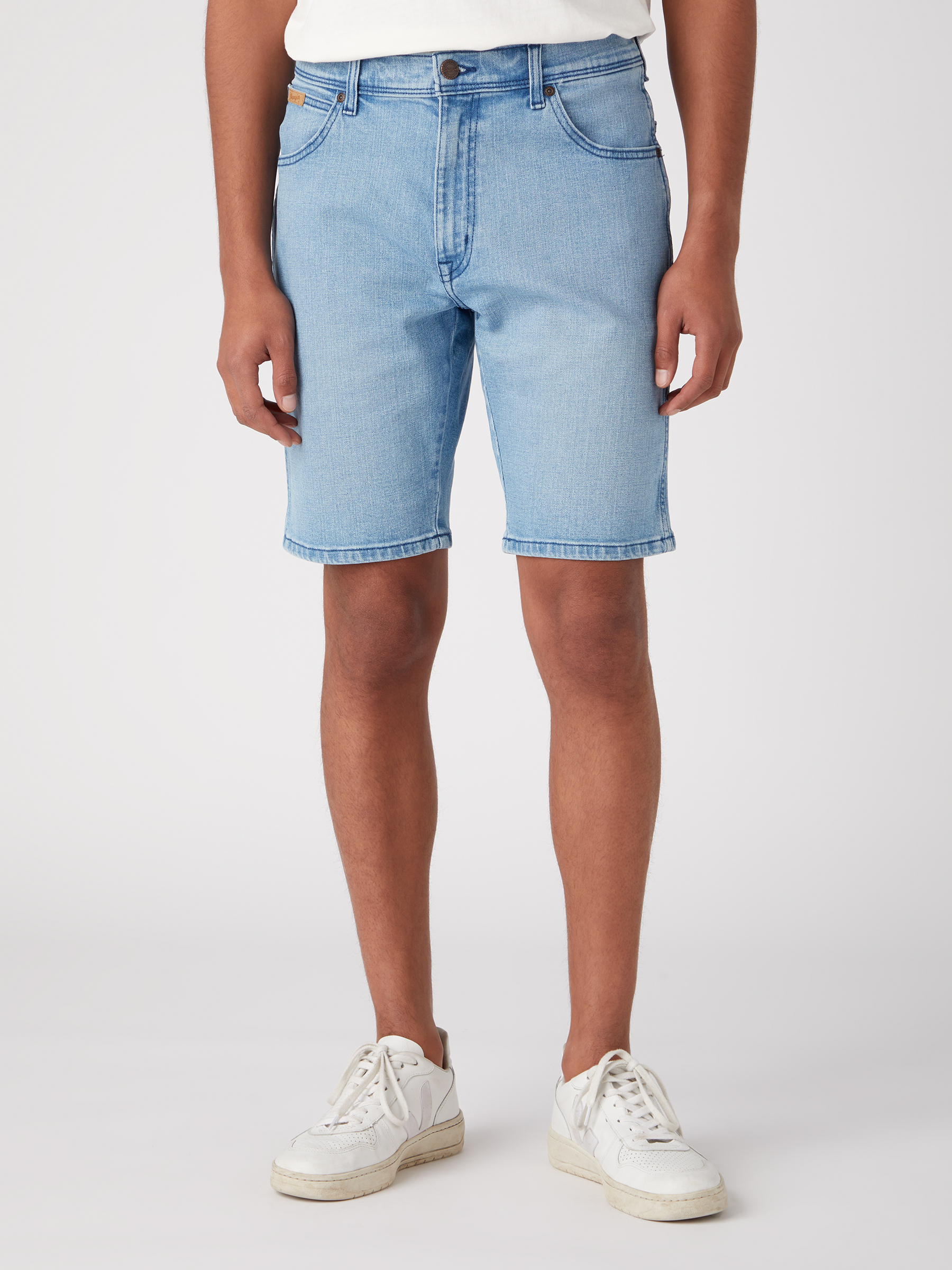 Pánske džínsové šortky WRANGLER v svetlomodrej farbe majú stredne vysoký pás, rovné nohavice ku kolenám a zipsové zapínanie. Obidve zadné vrecká sú prešite dvojitým stehom svetlej farby v tvare W. Na pravom zadnom vrecku nájdete typickú koženú nášivku s logom značky WRANGLER. Vyrobené sú z denimu a ľahkou prímesou elastanu, ktorý zaisťuje vysokú dávku pohodlia pri nosení.