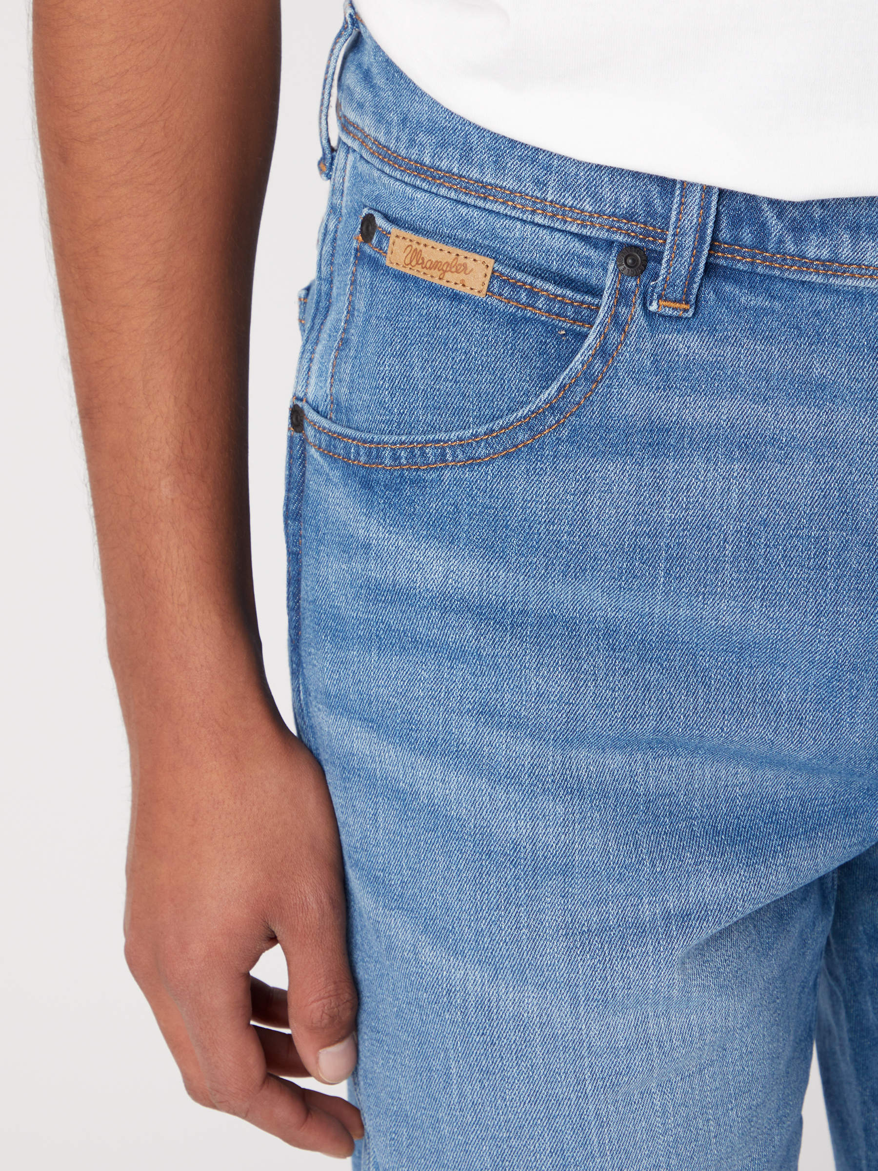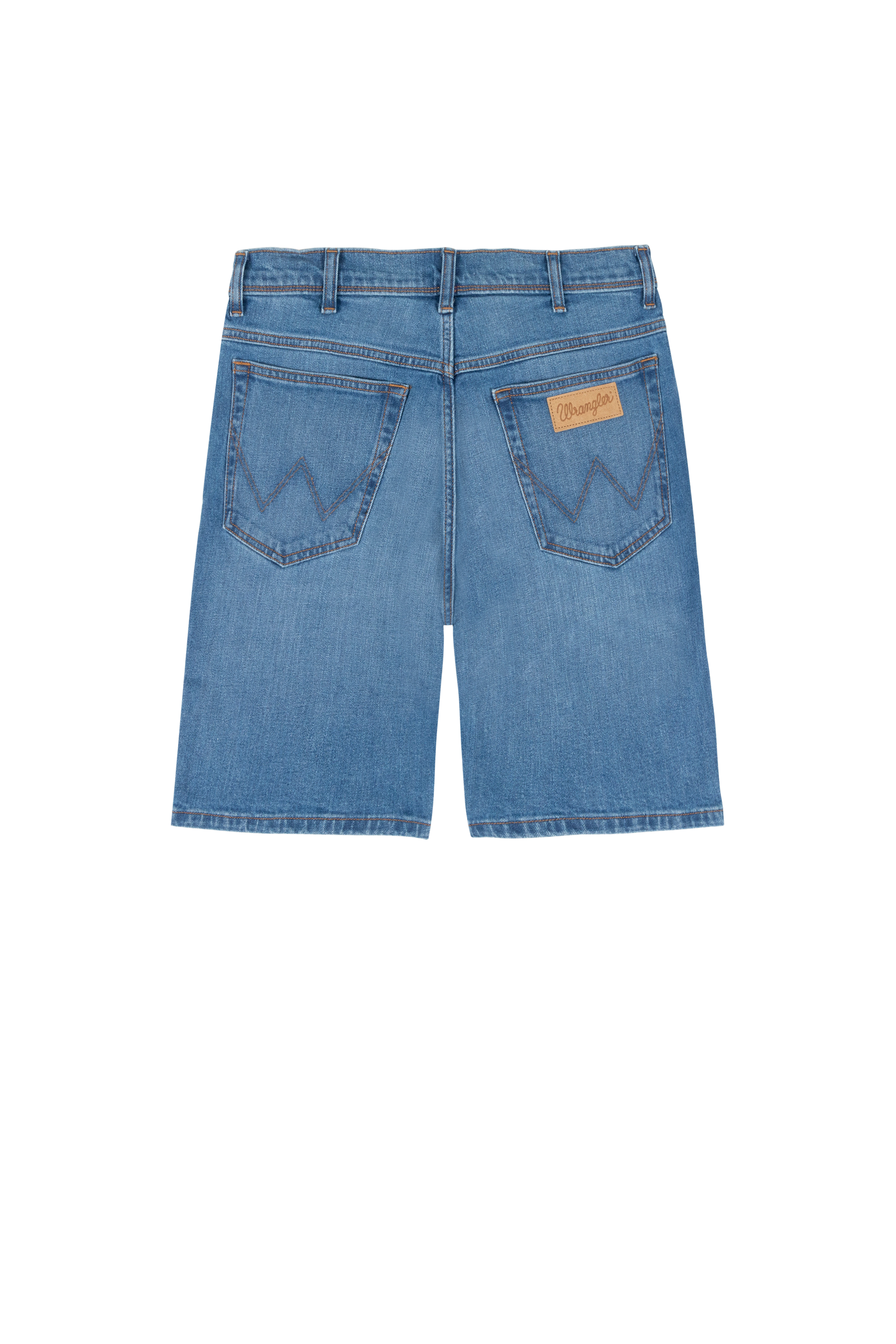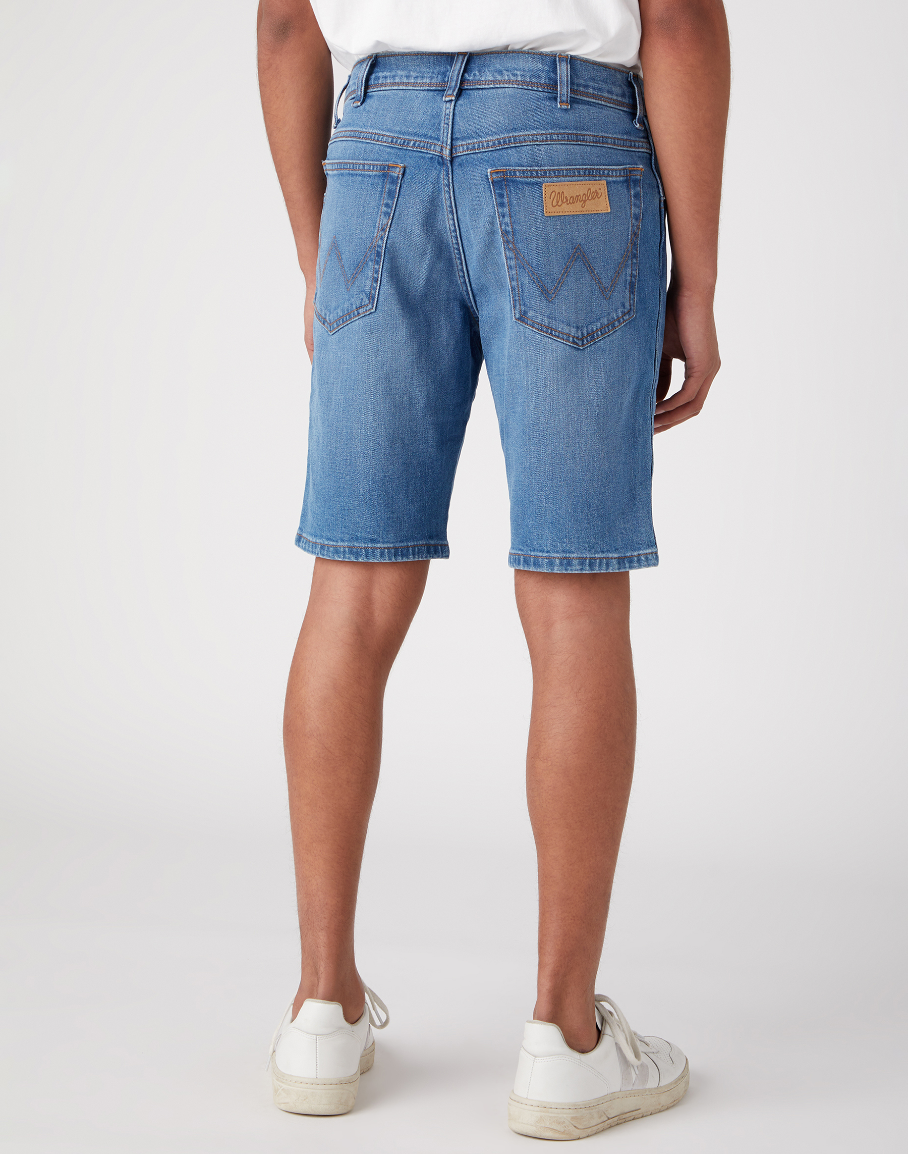 Pánske džínsové šortky WRANGLER v modrej farbe majú stredne vysoký pás, rovné nohavice ku kolenám a zipsové zapínanie. Obidve zadné vrecká sú prešite dvojitým stehom svetlej farby v tvare W. Na pravom zadnom vrecku nájdete typickú koženú nášivku s logom značky WRANGLER.  Vyrobené sú z denimu a ľahkou prímesou  elastanu, ktorý zaisťuje vysokú dávku pohodlia pri nosení.