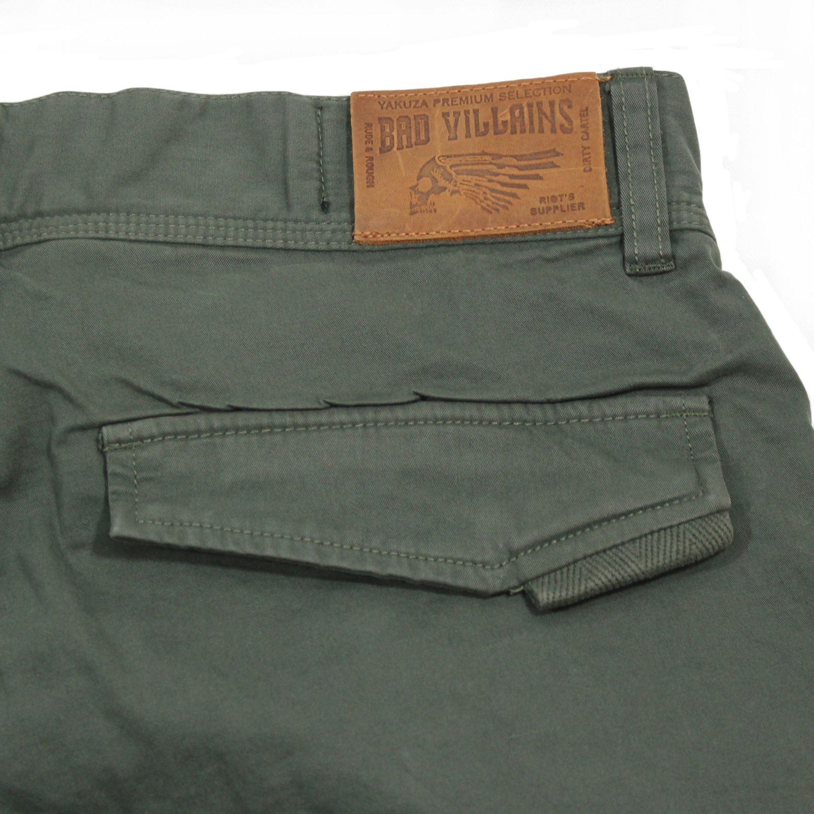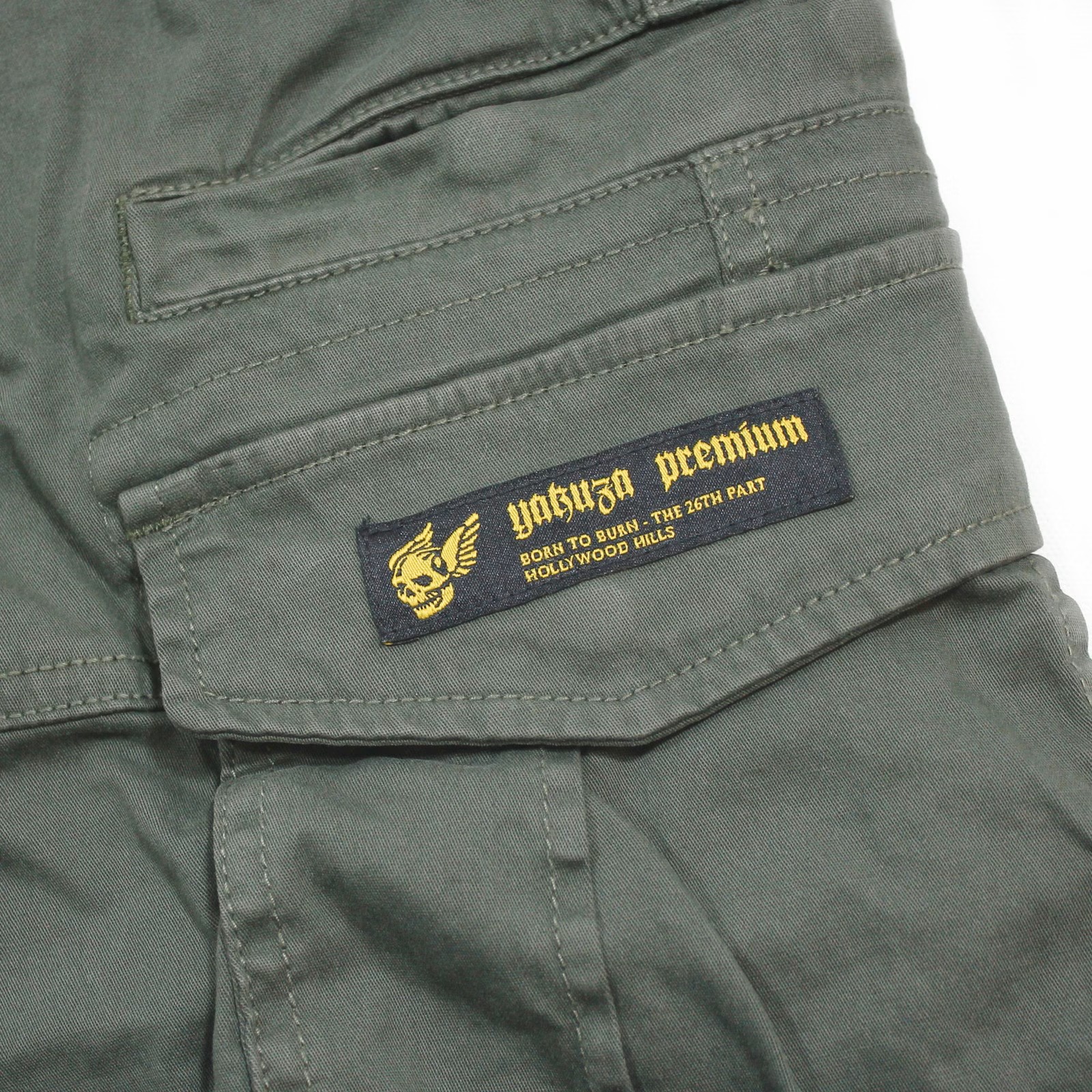Cargo kraťasy Yakuza Premium 3852 v zelenej tmavo olivovej farbe zaujmú výrazným streetovým štýlom a dôrazom na detail. Vyrobené sú z kvalitného materiálu, ktorý zaisťuje pohodlie a odolnosť aj pri každodennom nosení. Kraťasy majú celkom osem praktických vreciek – dve klasické bočné, dve zadné a dve na stehnách, ktoré zdobia ikonické nášivky Yakuza Premium a čierne štítky s motívmi značky + 2 malé zapínateľné na cvok.