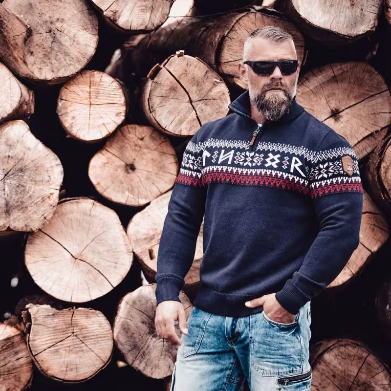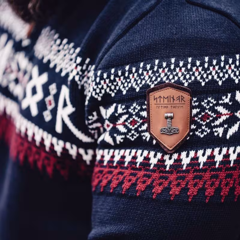 Tento tradičný nórsky sveter určite upúta pozornosť! Medzi jeho vlastnosti patria kvalitné rebrované manžety a lem, prepracované kožené záplaty na rukávoch a leme.