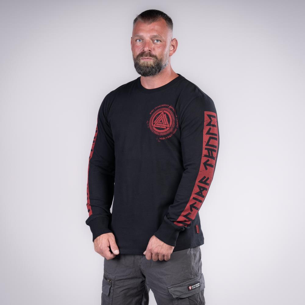 Klasické tričko Thor Steinar s dlhým rukávom s tradičným TS motívom! Priliehavý strih, okrúhly výstrih lemuje úplet, kryté vnútorné švy zaisťujú príjemné nosenie, kontrastné prešitie manžety sú vyrobené z pevného úpletu, veľká runová potlač na rukávoch ,menšie Walknut motív na hrudi, malé logo za krkom, všitý štítok v bočnom šve.