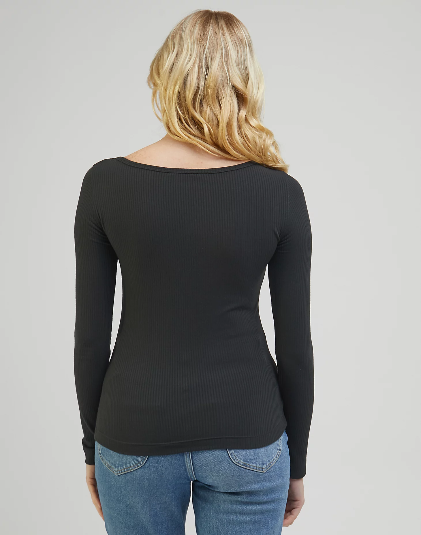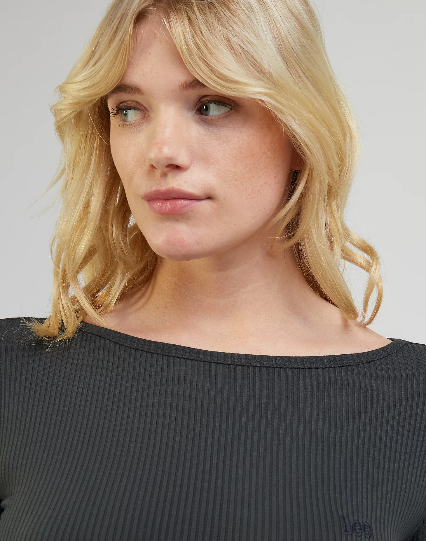 Toto je priliehavý top s dlhými rukávmi a priliehavou rebrovanou štruktúrou. Lodný výstrih je široký, lemuje ramená a odhaľuje kľúčnu kosť. Táto tkanina je vyrobená z priľnavého rebrovaného materiálu s veľkým množstvom strečového materiálu, aby sa zabezpečilo, že sa priľne k pokožke. V uhľovo sivej farbe ide o všestrannú verziu topu.