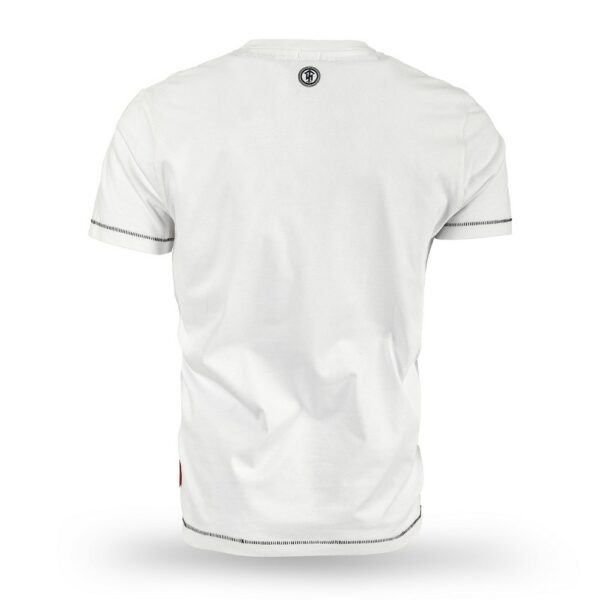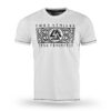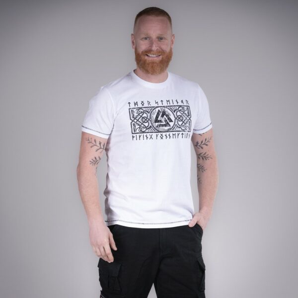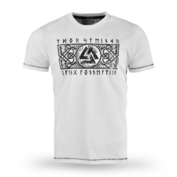 Tričko priliehavého strihu s prepracovaným vikingským motívom pozostávajúcim z Wotanovho uzla a tlačených rún ako predného motívu, ako aj s malým tlačeným motívom krku. Lem a švy rukávov v kontraste. Zloženie: 100% Bavlna