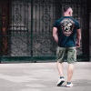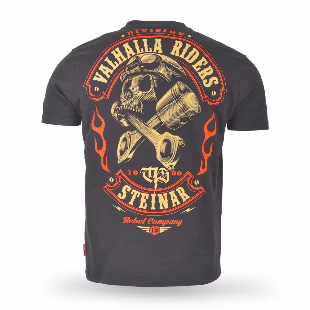 Pánske tričko Thor Steinar “Valhalla Riders” voľného strihu s potlačou na chrbte s motívom lebky a piestu. Decentná výšivka na hrudi, okrúhly výstrih.  Prešívanie v farbe bavlny , nit s lebkou na rukáve .