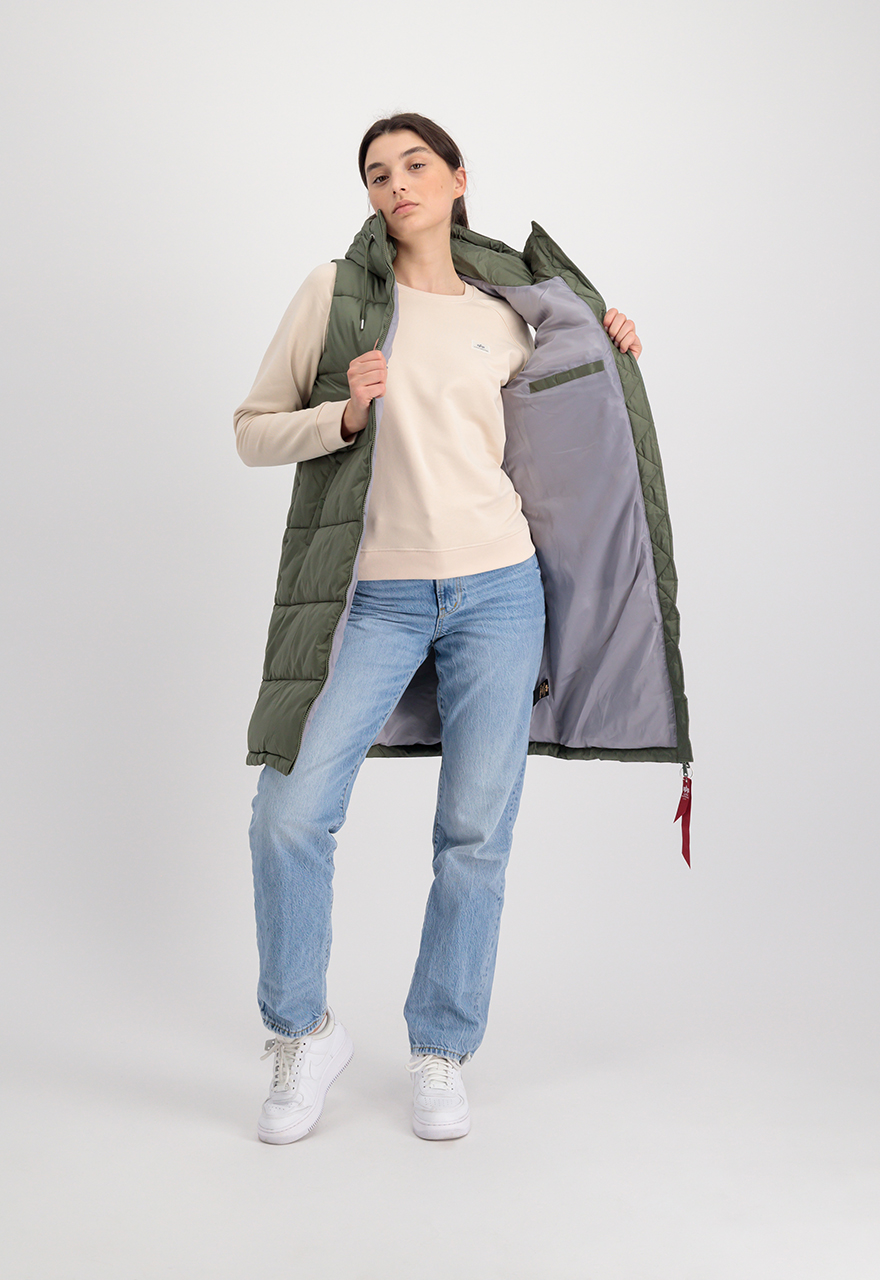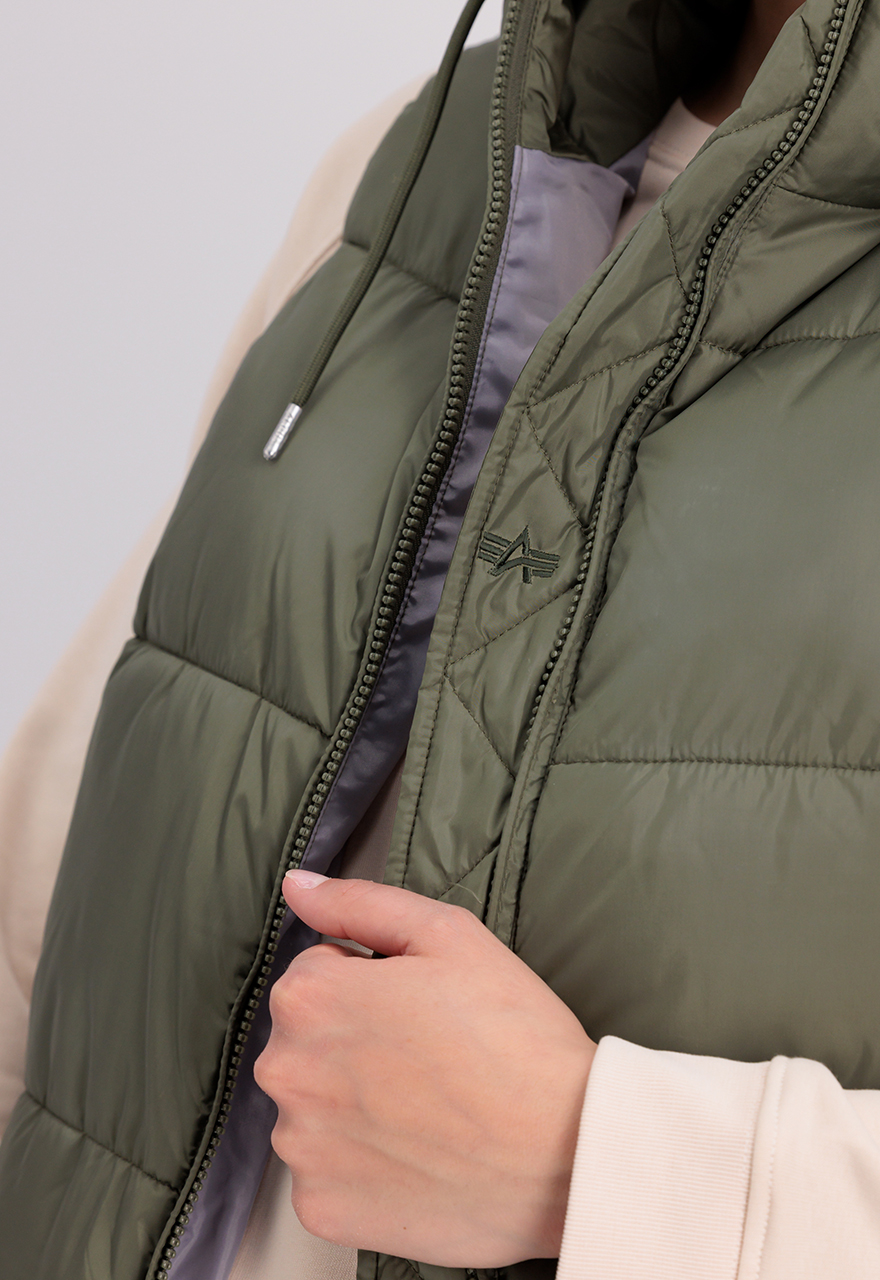Dámska vesta pravidelného strihu pod kolená s kapucňou. Prešívaná vesta je z vonkajšej strany z odolného polyesteru, podšívka je z príjemného nylónu. Veľkú kapucňu si môžete nastaviť individuálne pomocou klasickej šnúrky. Dve bočné vrecká a jedno vnútorné vrecko.